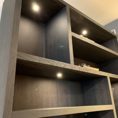Deze vakkenkast heeft 6 open vakken waarvan er 3 zijn verlicht met kleine led lampen. Aan de onderkant heeft de kast 2 deuren en 2 lades.