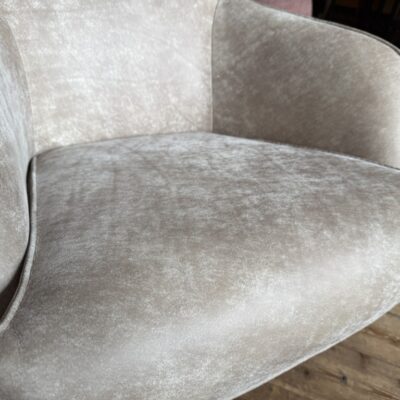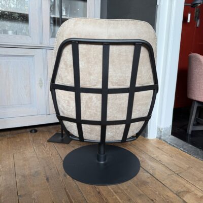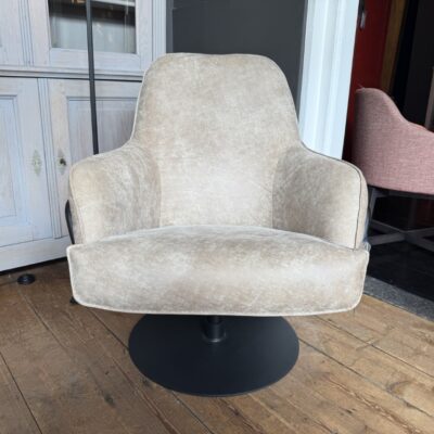 Fauteuil Jurgen, uitgevoerd in leer: Conrete – Sand met een schijfvoet rond in het zwart. Leverbaar in zeer veel stofsoorten en leer.