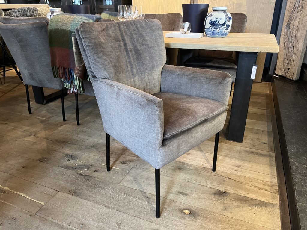 Eetkamerstoel Woodbury, met armleuning en draaipoot (A), uitgevoerd in stof: Trenza Taupe (SG2).