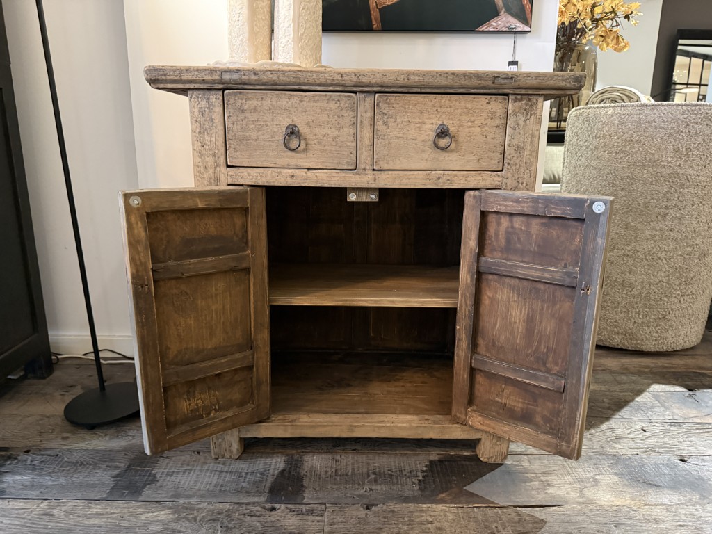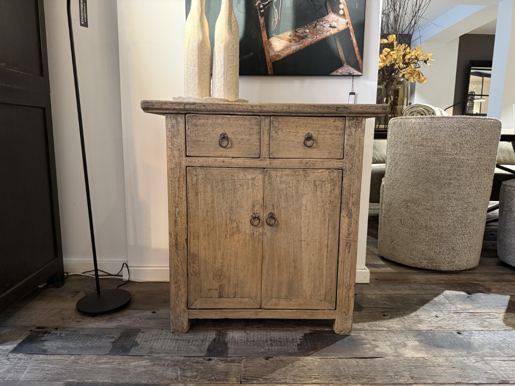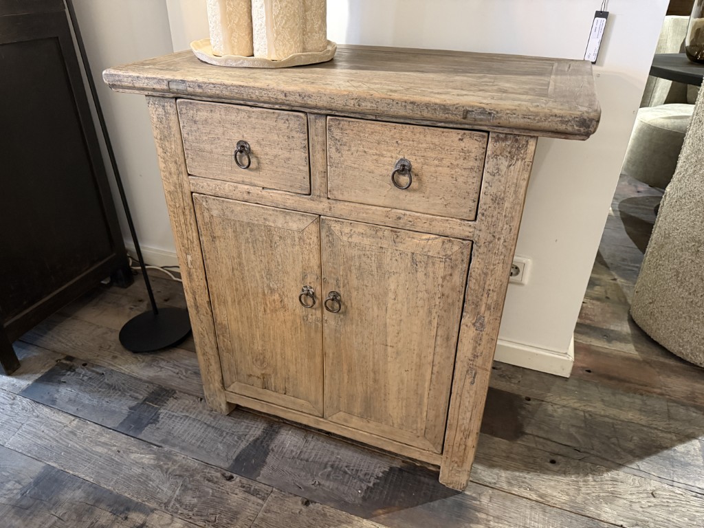 Antiek Chinees kastje met twee deuren en twee lades, gemaakt van old pine hout.
