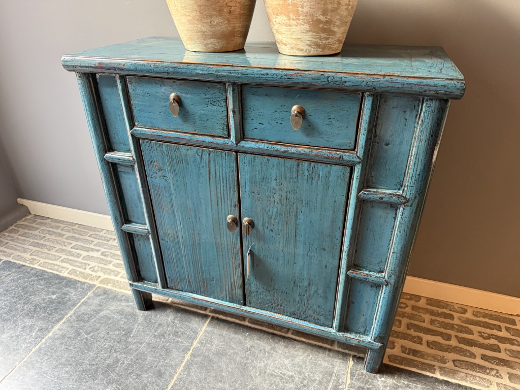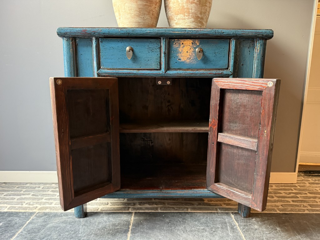 Antiek Chinees kastje met 2 deuren en 2 lades, gemaakt van old pine hout. Het kastje is bewerkt met blauwe lak.