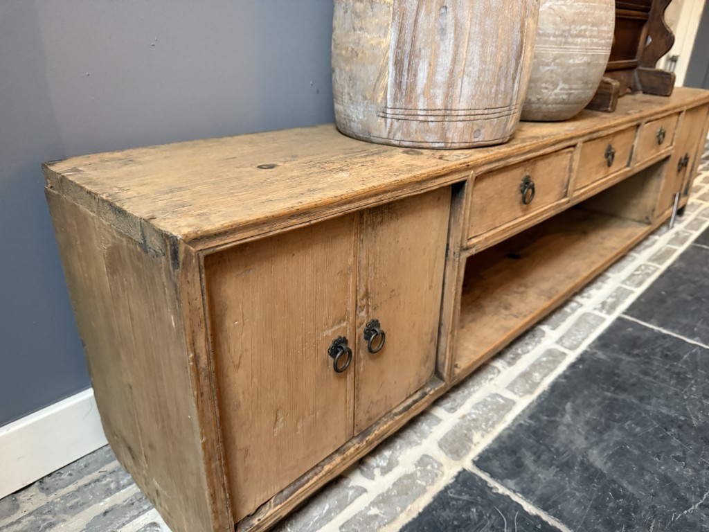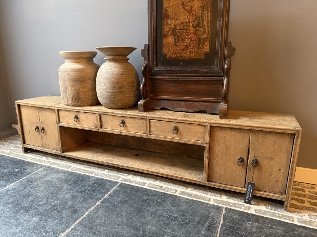 Antiek Chinees TV-dressoir met 4 deurtjes en 3 lades, gemaakt van old pine hout.