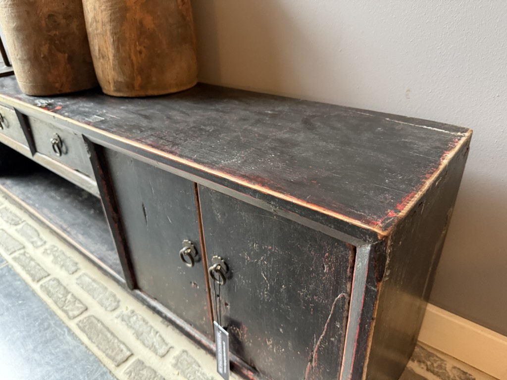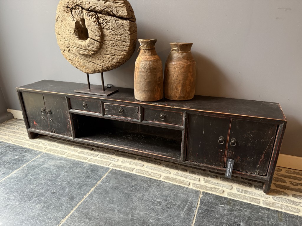 Antiek Chinees TV-dressoir met 4 deurtjes en 3 lades, gemaakt van old pine hout.