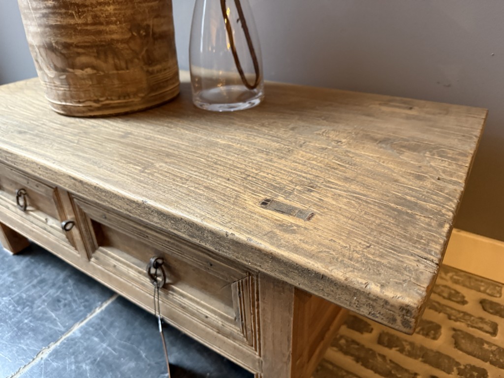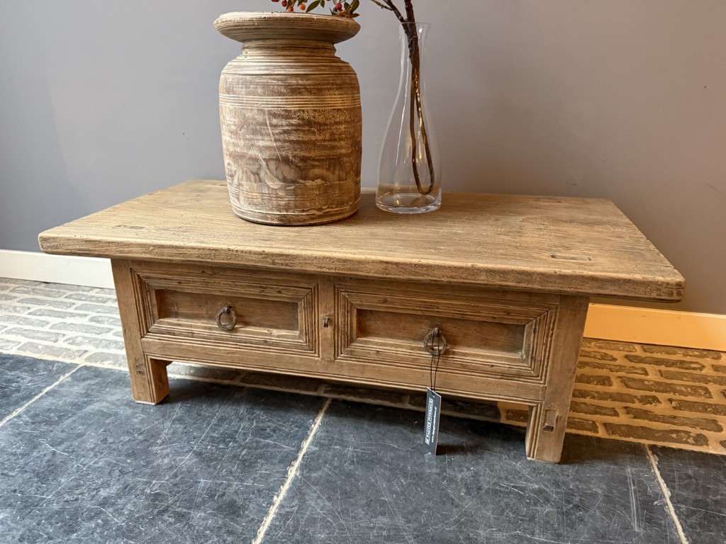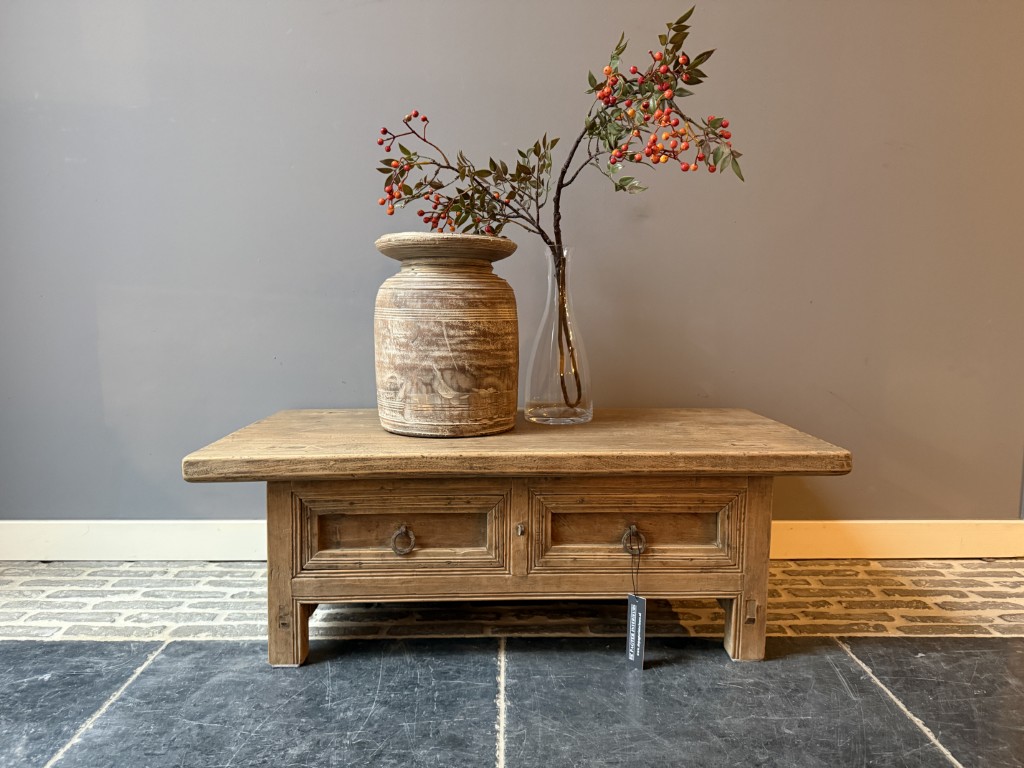 Antiek Chinese salontafel met 2 lades, gemaakt van old pine hout.