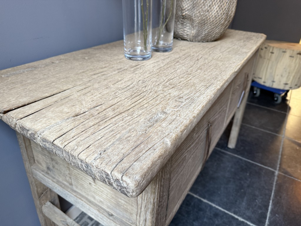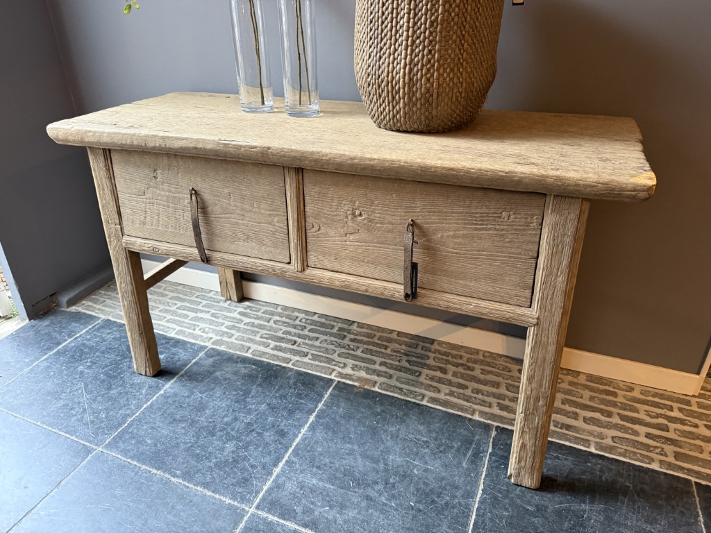 Antiek Chinese wandtafel met 2 lades, gemaakt van olmenhout.