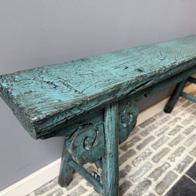 Blauw gelakt bankje, gemaakt van old pine hout.