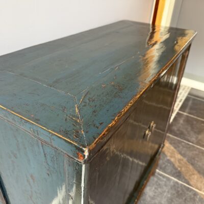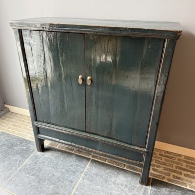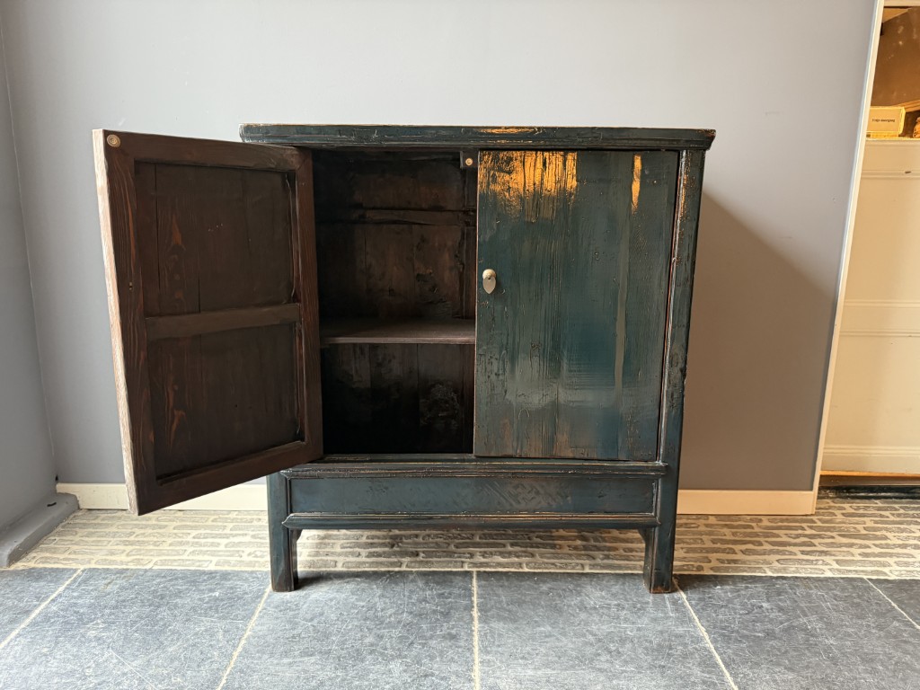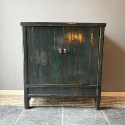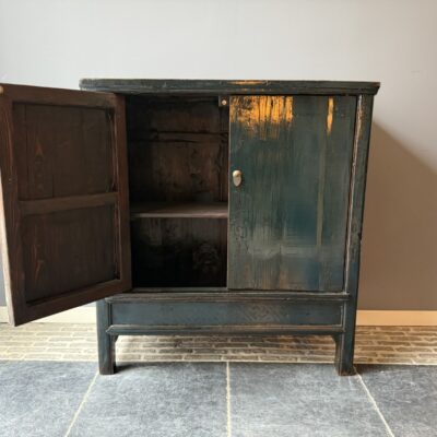 Donker blauw gelakt kastje met 2 deuren, gemaakt van old pine hout.