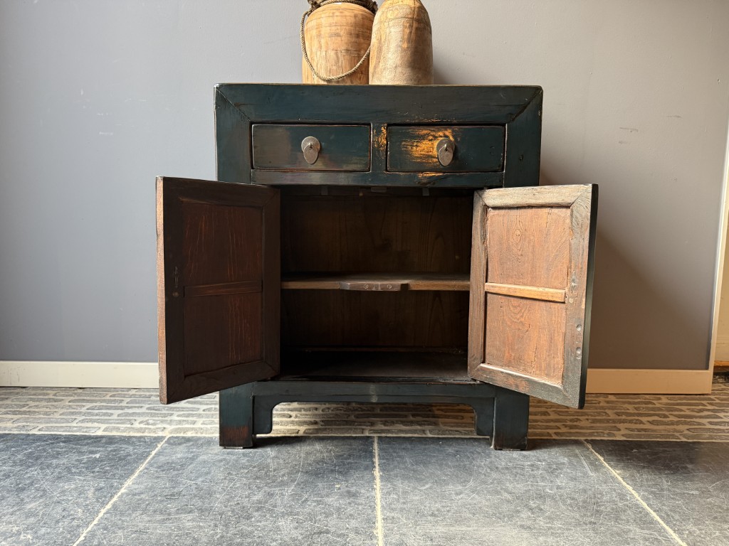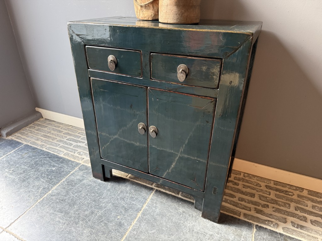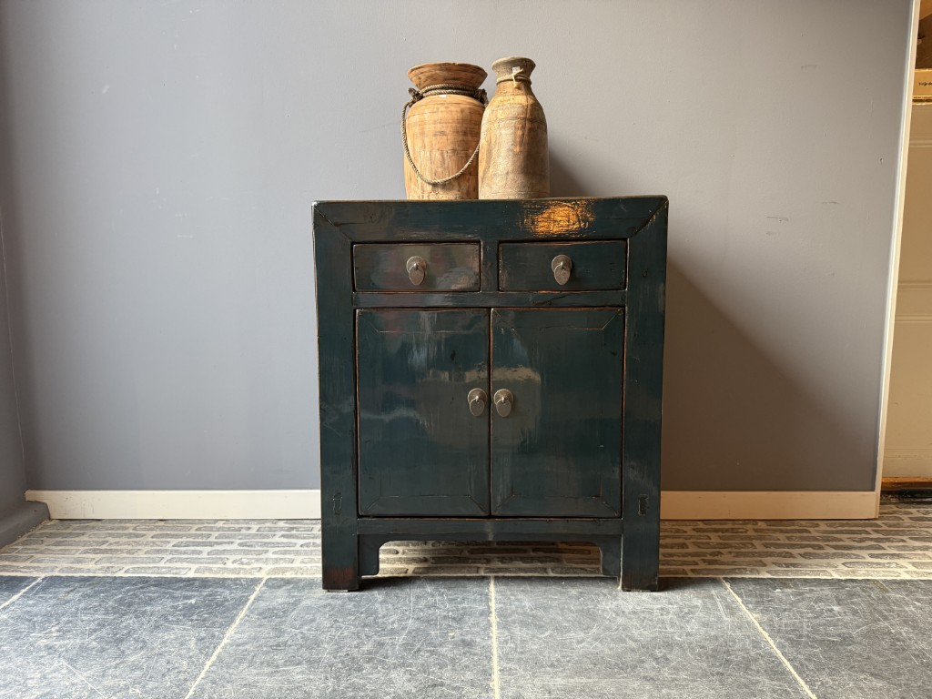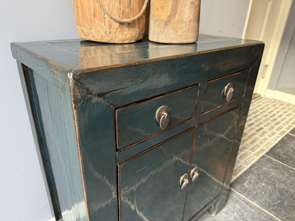 Donker blauw gelakt kastje met 2 deuren en 2 lades, gemaakt van old pine hout.