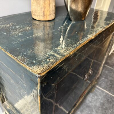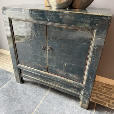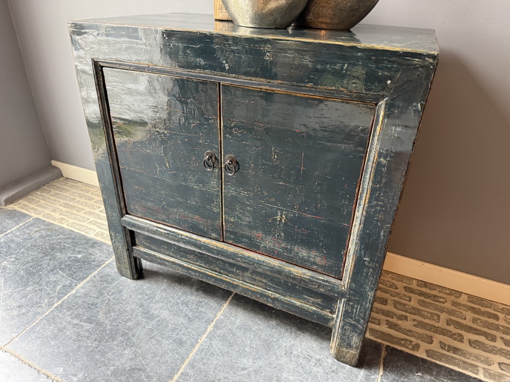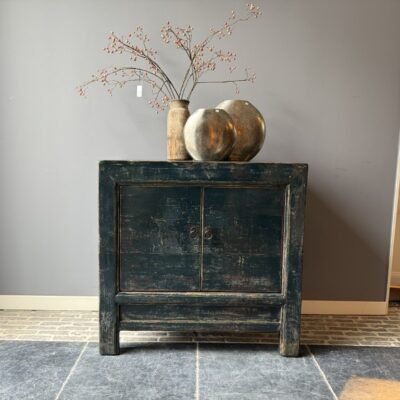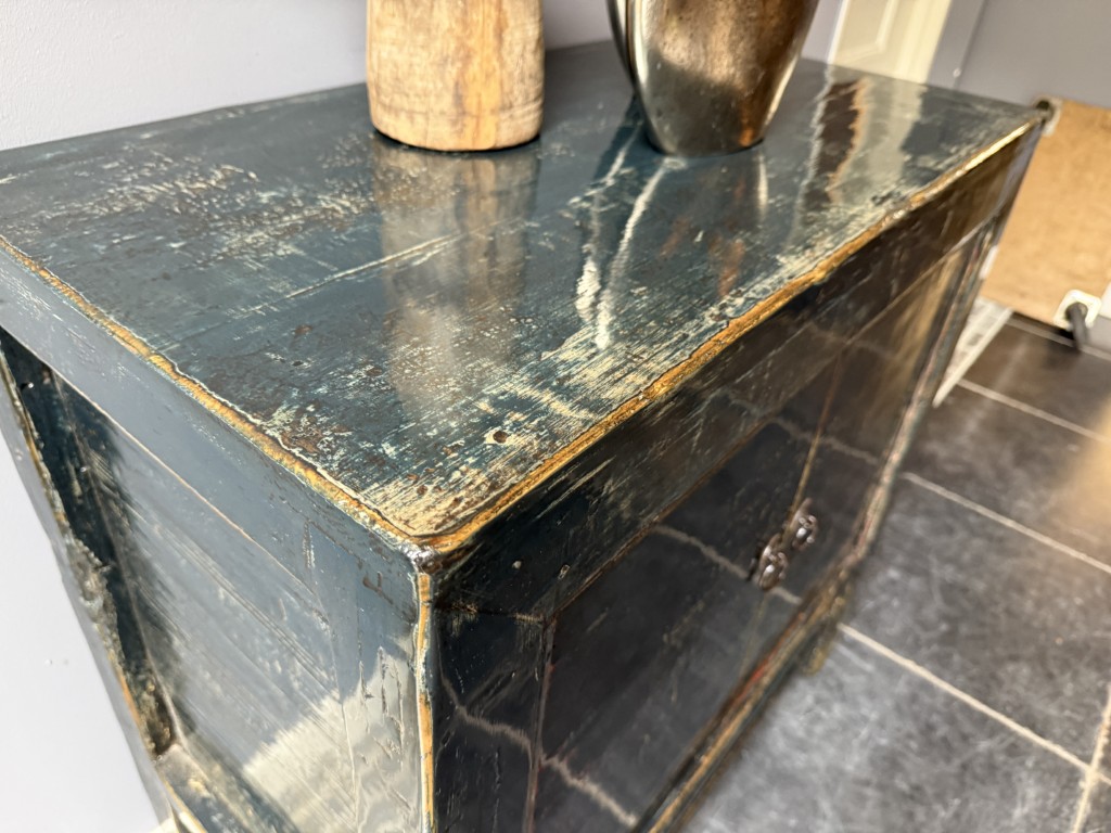 Donker blauw gelakt kastje met 2 deurtjes, gemaakt van old pine hout.