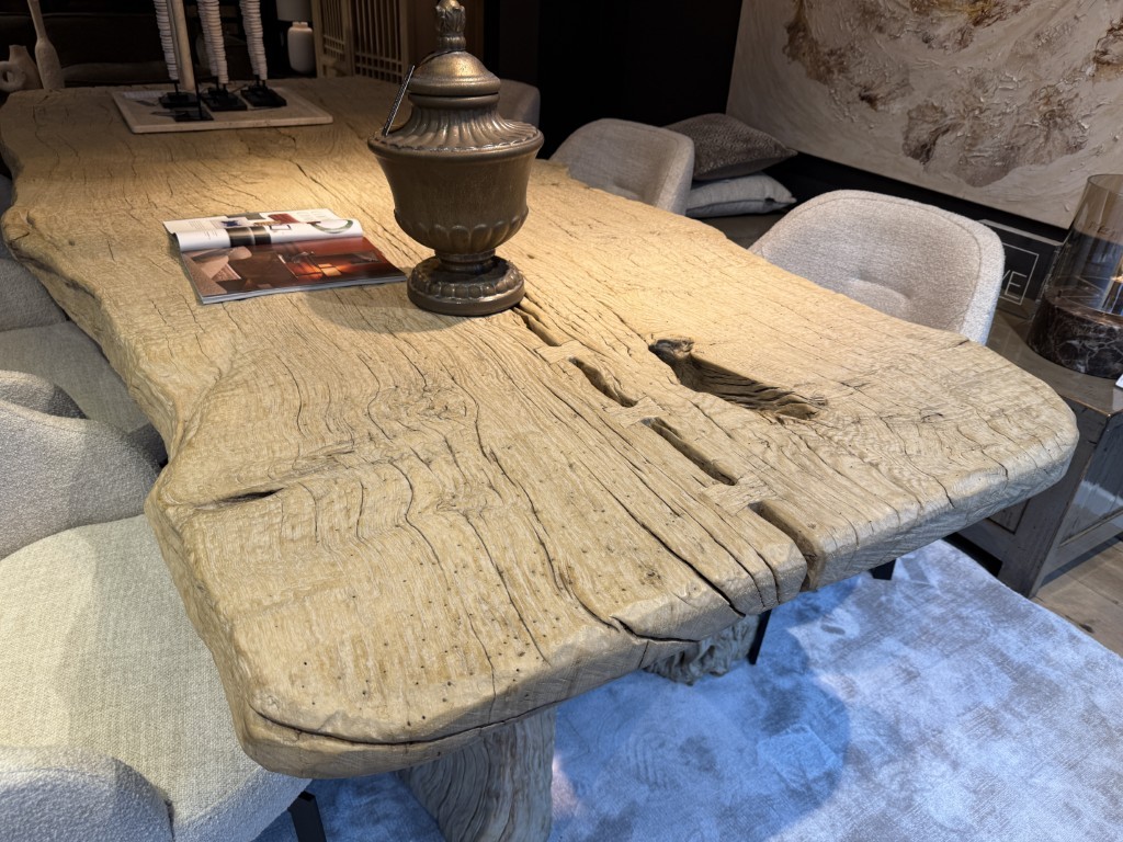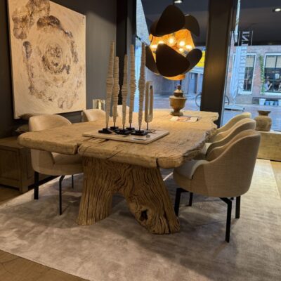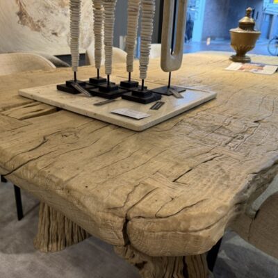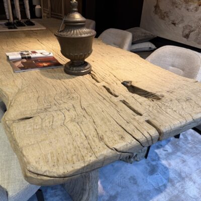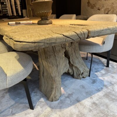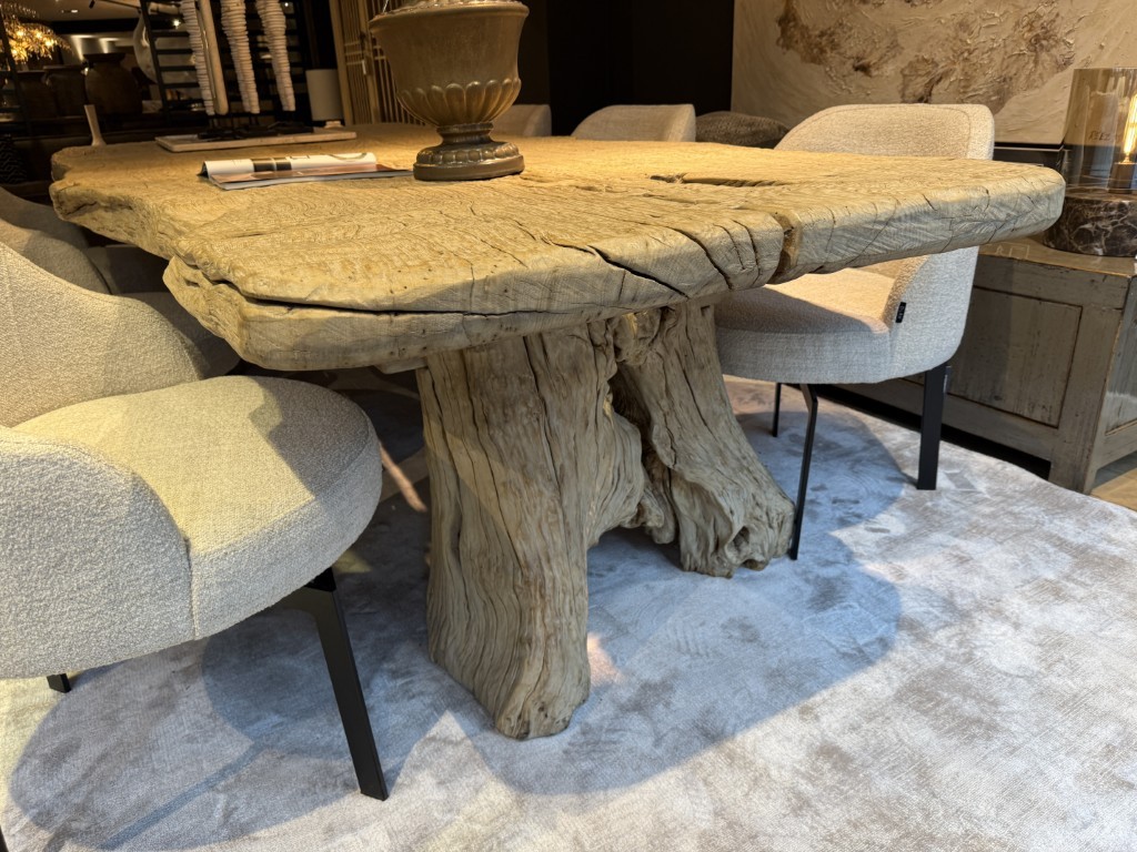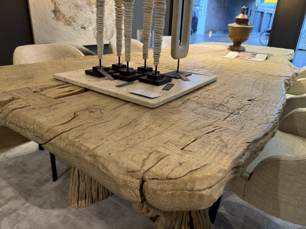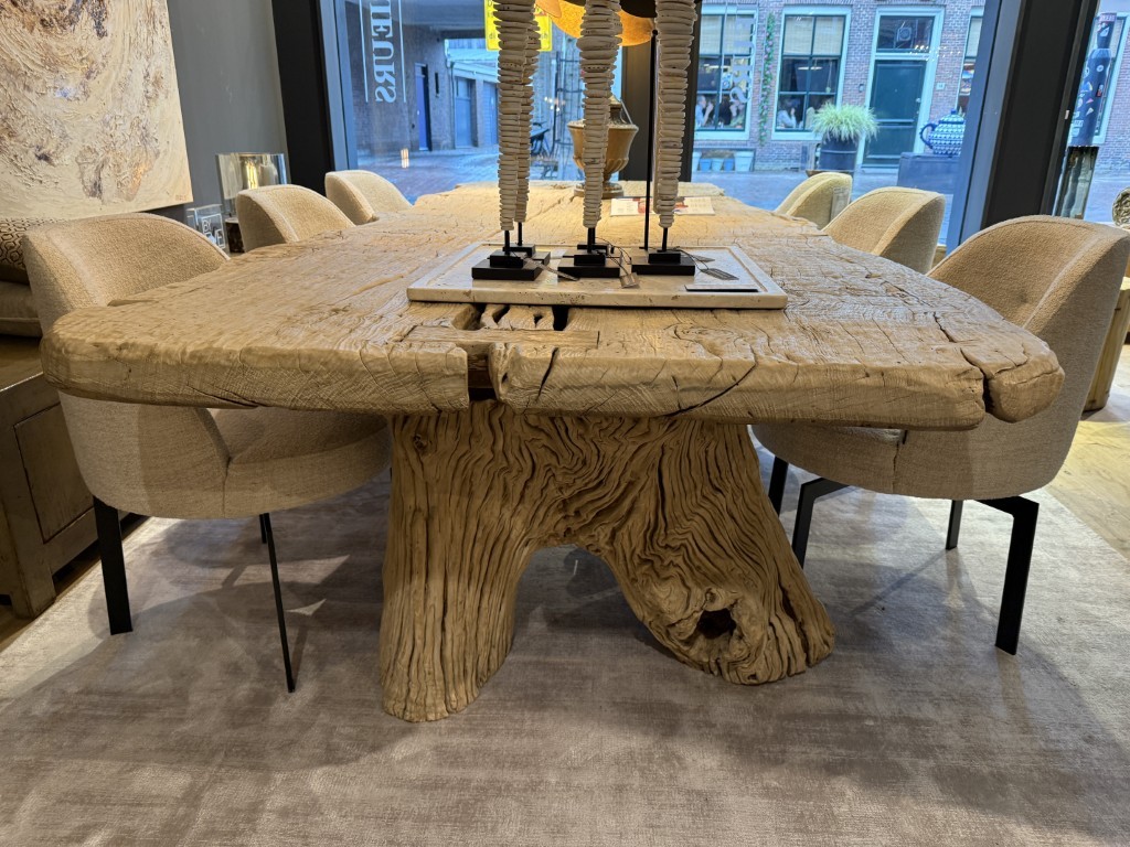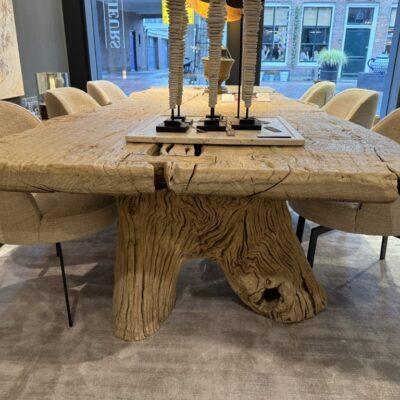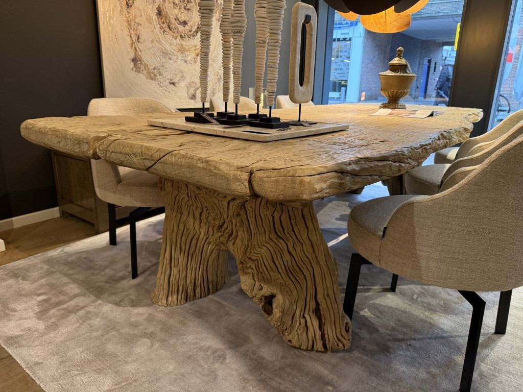 Robuuste eettafel, gemaakt van grof olmenhout. Het tafelblad is organisch gevormd en staat op twee boomstamvormige poten.
