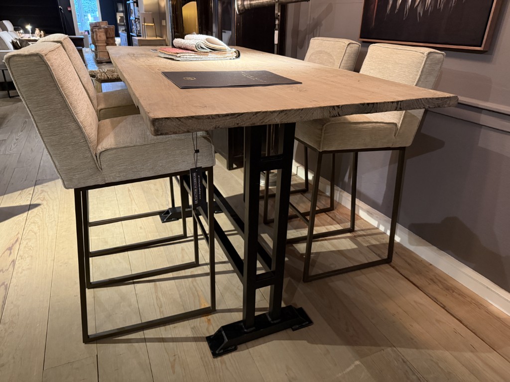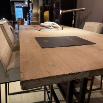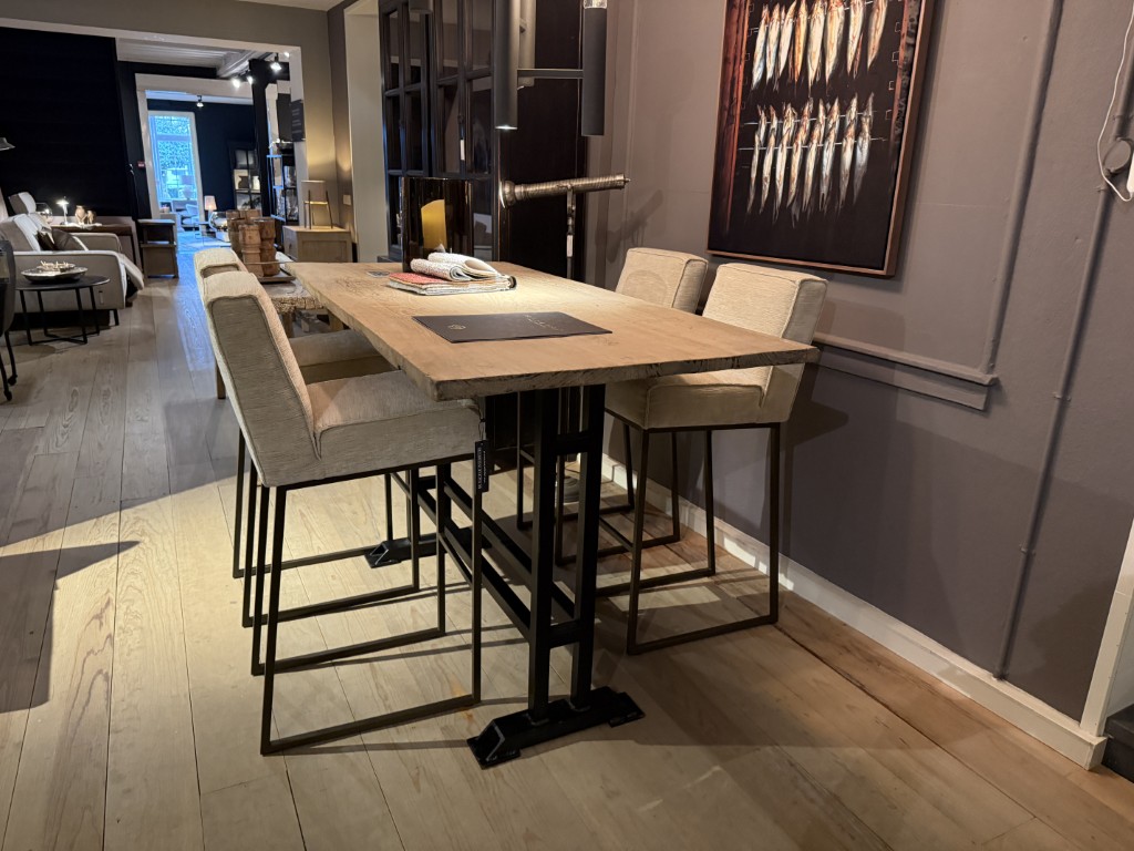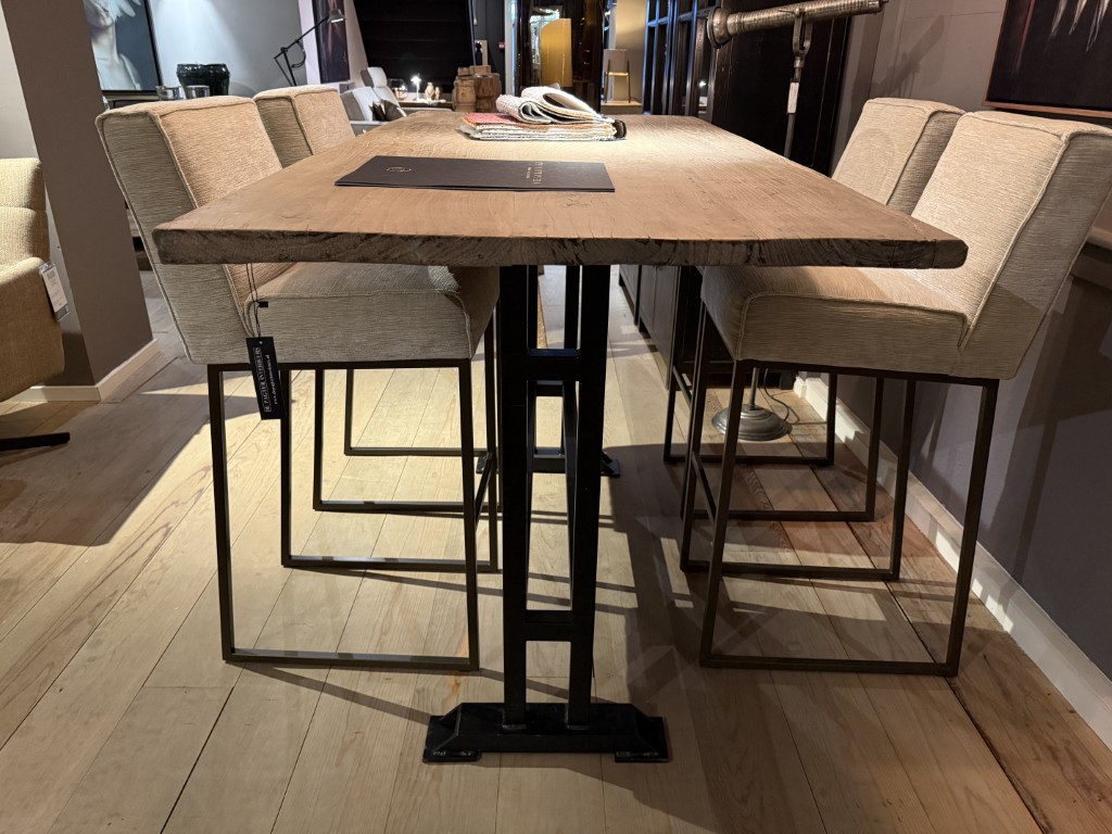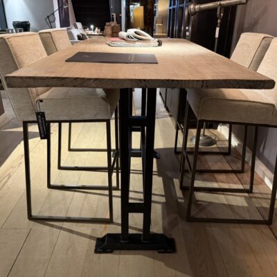 Landelijke bartafel, gemaakt van een olmenhouten tafelblad en een zwart gepoedercoat metalen frame.