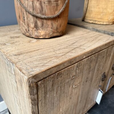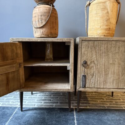 Set van twee nachtkastjes, gemaakt van olmenhout en metalen puntpootjes. De prijs is per stuk.