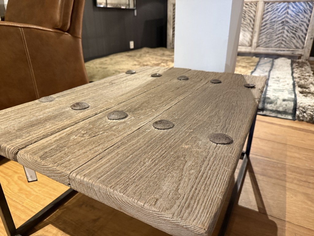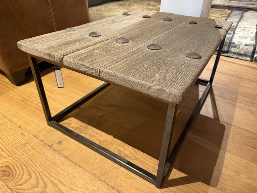 Landelijke salontafel, gemaakt van een olmenhouten tafelblad en een metalen frame.