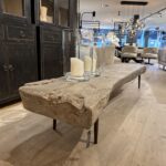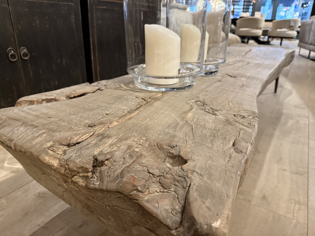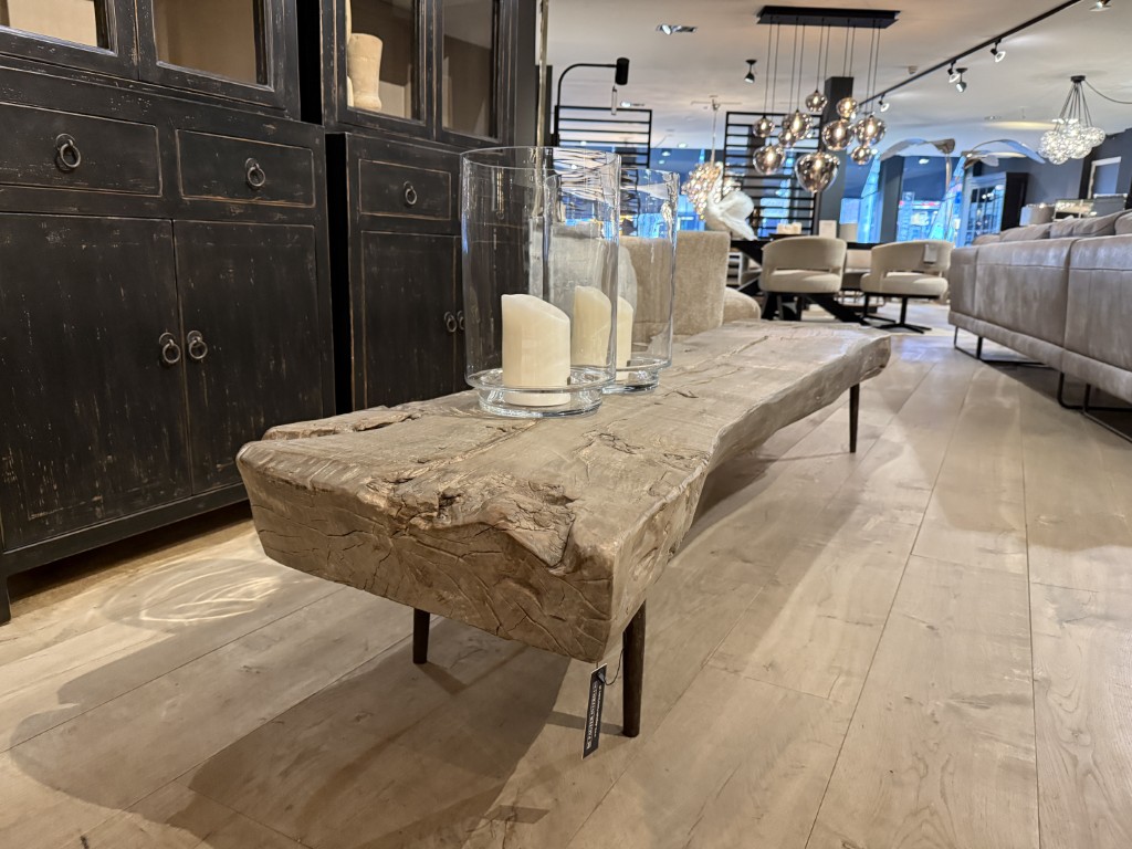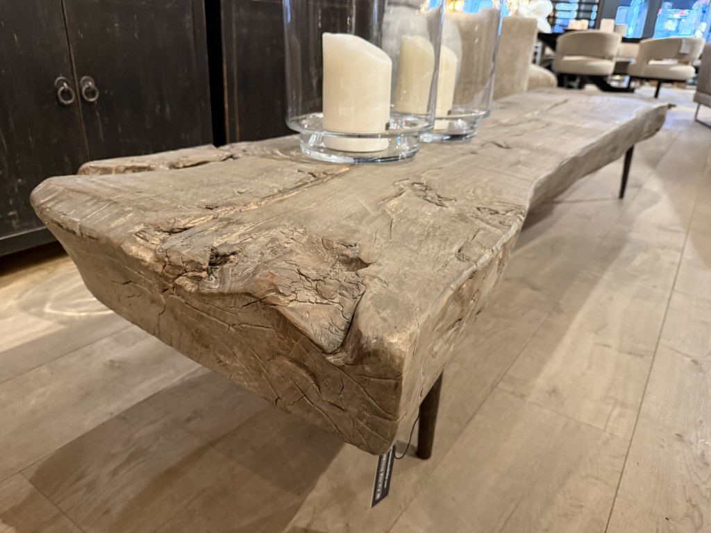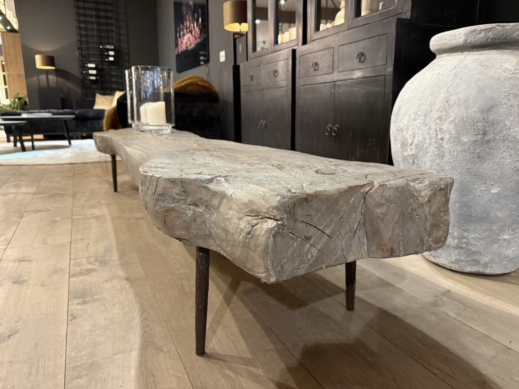 Salontafel, gemaakt van een dik, oud olmenhouten tafelblad en 4 metalen puntpootjes met een roestige look.