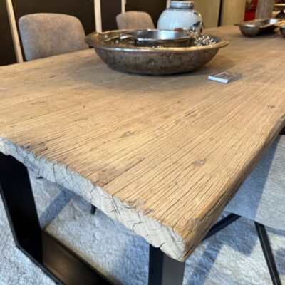 Eettafel, gemaakt van een olmenhouten blad en een zwart metalen frame.