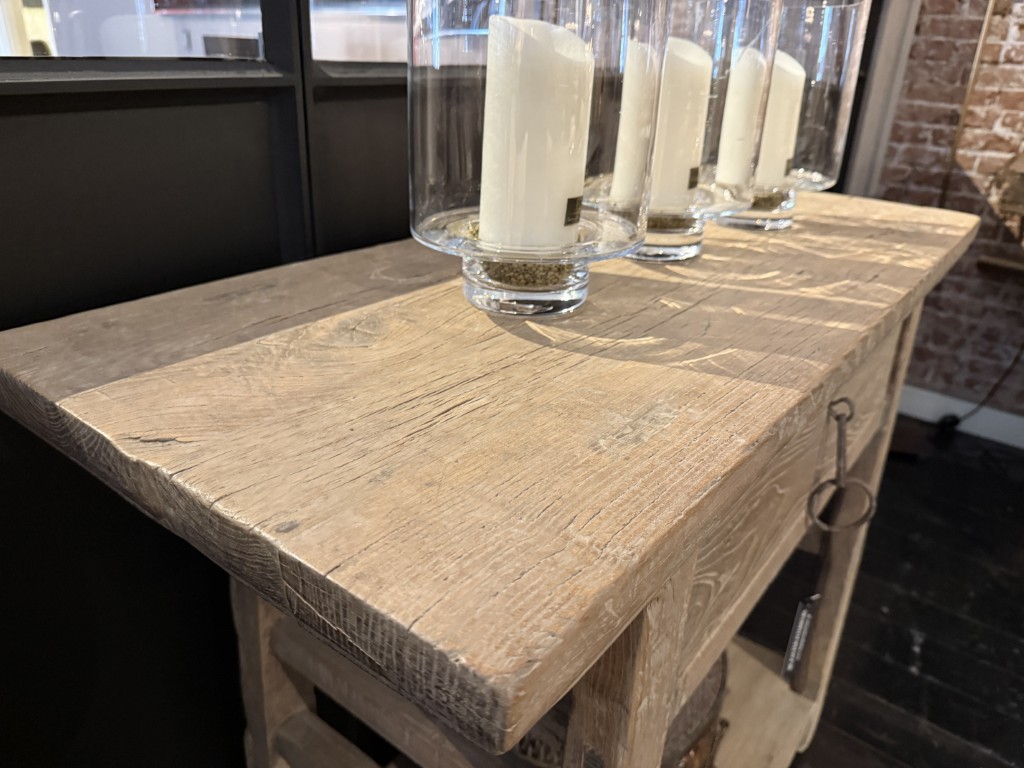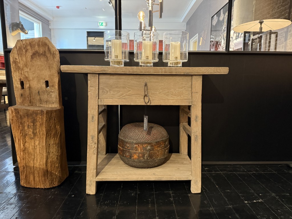 Landelijke wandtafel met een lade en een onderplank, gemaakt van olmenhout.