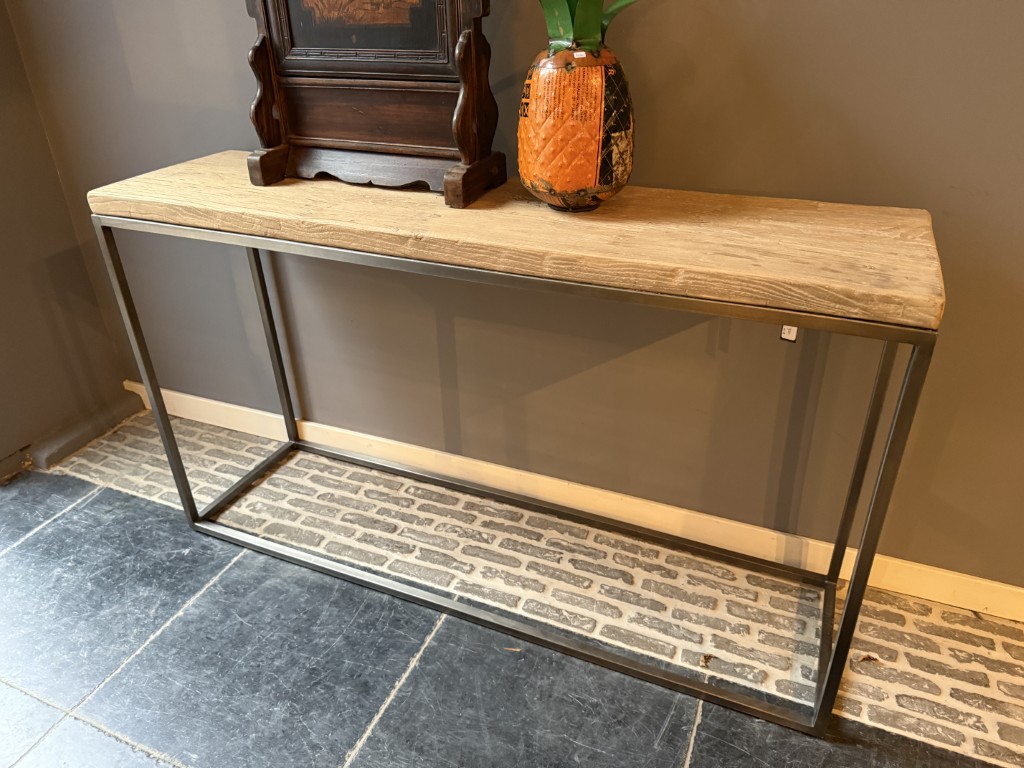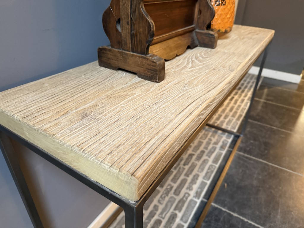 Landelijke wandtafel, gemaakt van een olmenhouten tafelblad en een metalen onderstel.