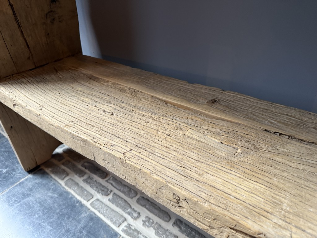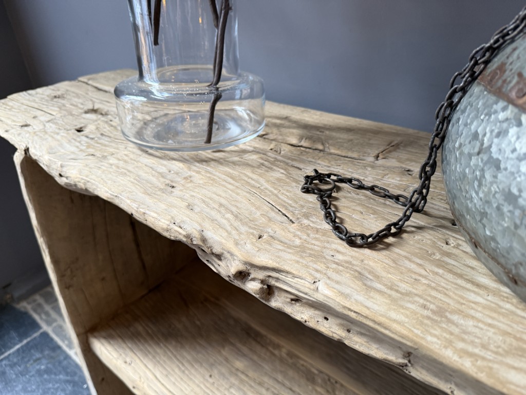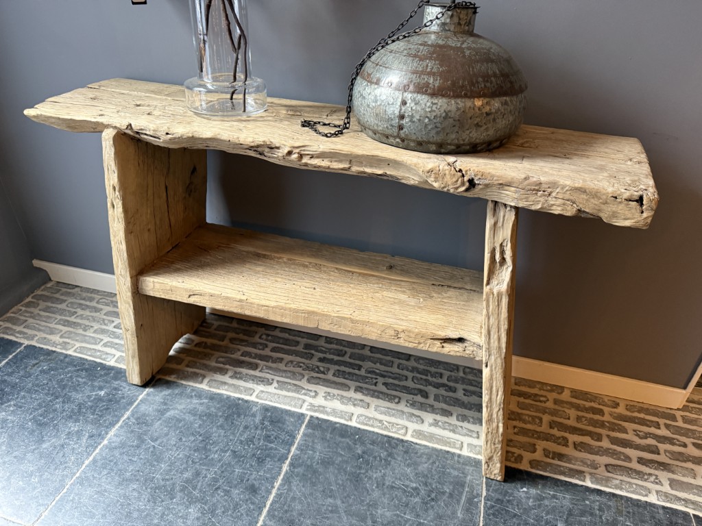 Landelijke wandtafel ‘Rob’, gemaakt van grof olmenhout. Ook verkrijgbaar in 180 cm en 210 cm.