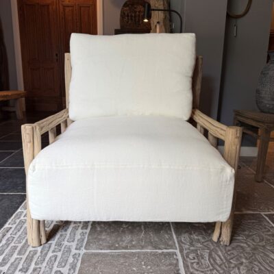 Fauteuil ‘Ibiza’, gemaakt van een grof olmenhouten frame en een wit, stoffen zit- en rugkussen.