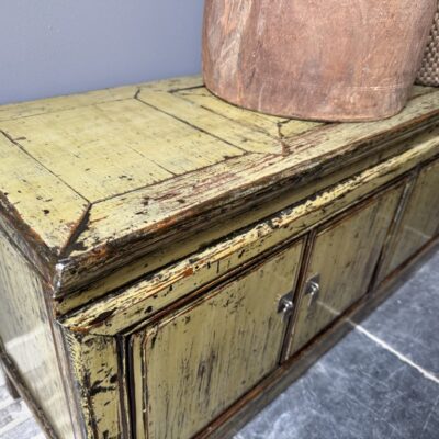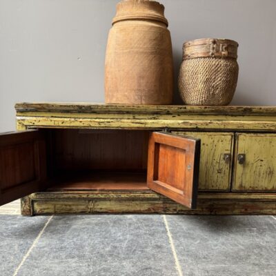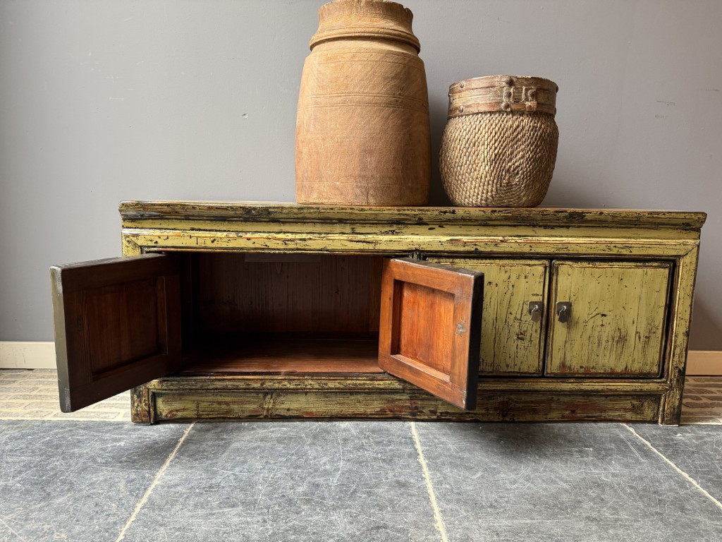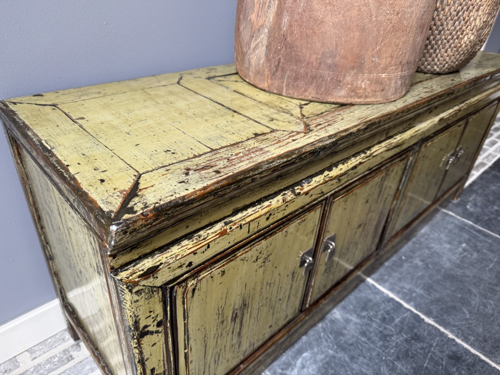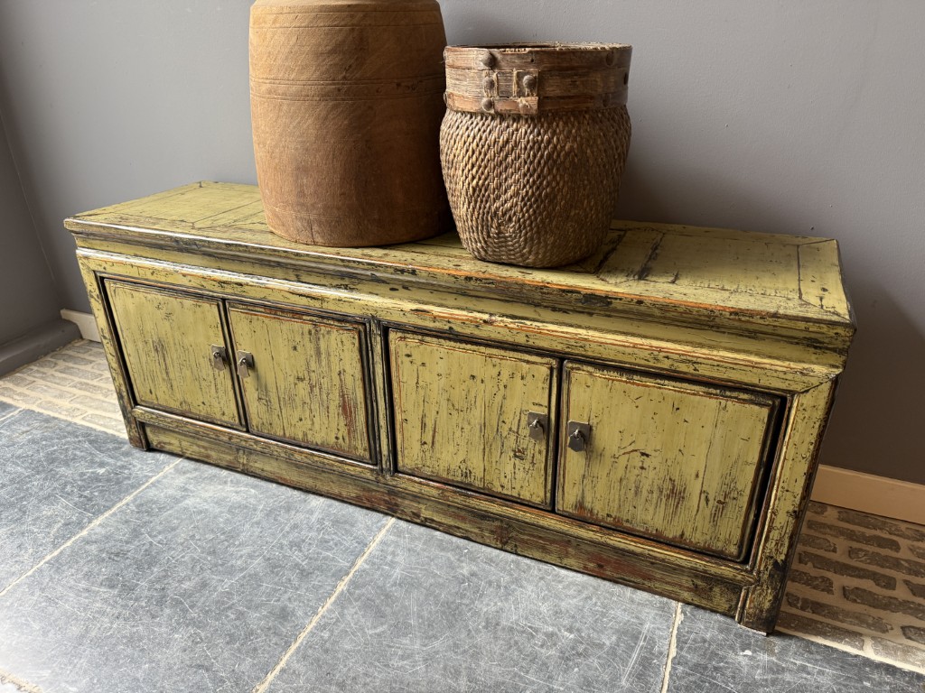 Groen gelakt TV-dressoir met 4 deuren, gemaakt van old pine hout.