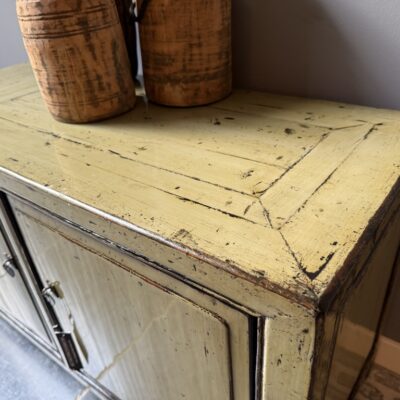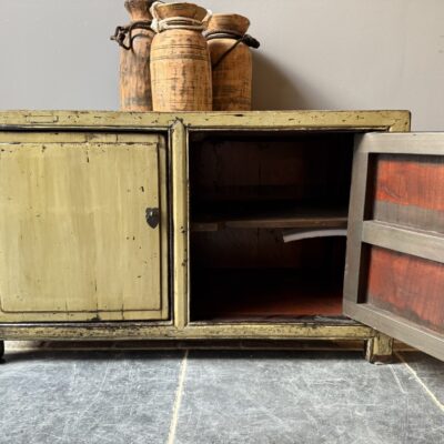 Groen gelakt TV-dressoir met 2 deuren, gemaakt van old pine hout.