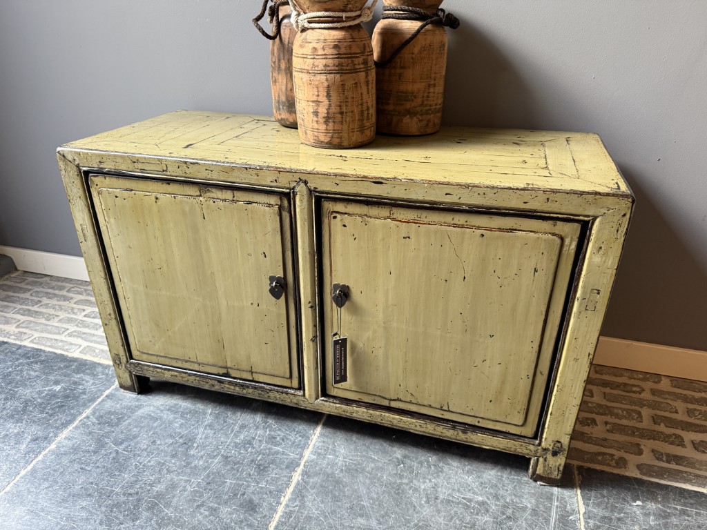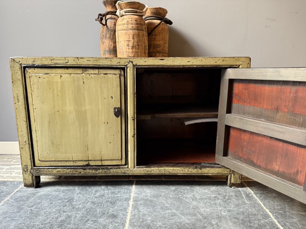 Groen gelakt TV-dressoir met 2 deuren, gemaakt van old pine hout.
