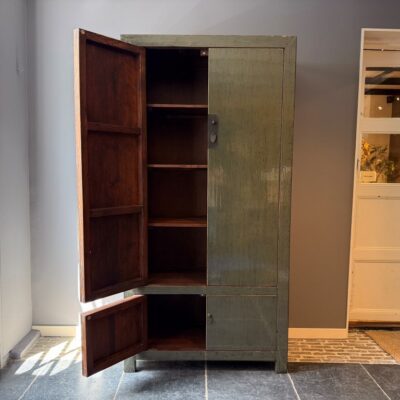 Donker groen gelakte kast ‘Colorado’ met 4 deuren, gemaakt van old pine hout.