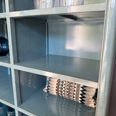 Open kast ‘Sardegna’, gemaakt van old pine. De kast is bewerkt met turquoise lak.