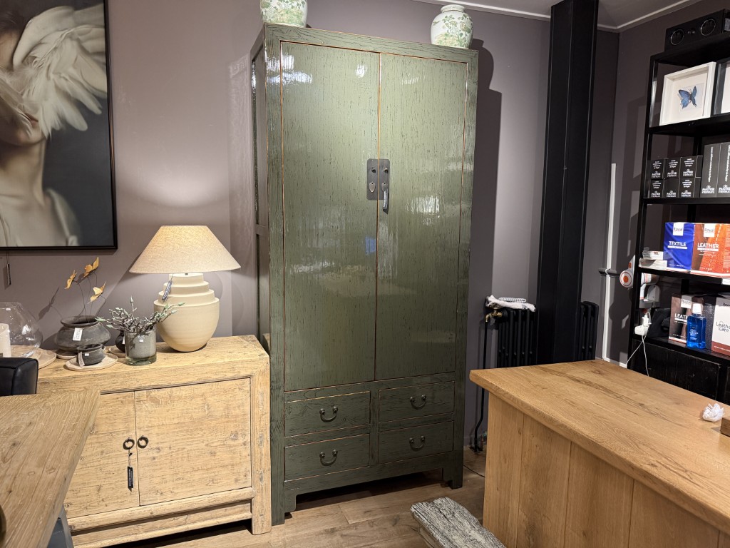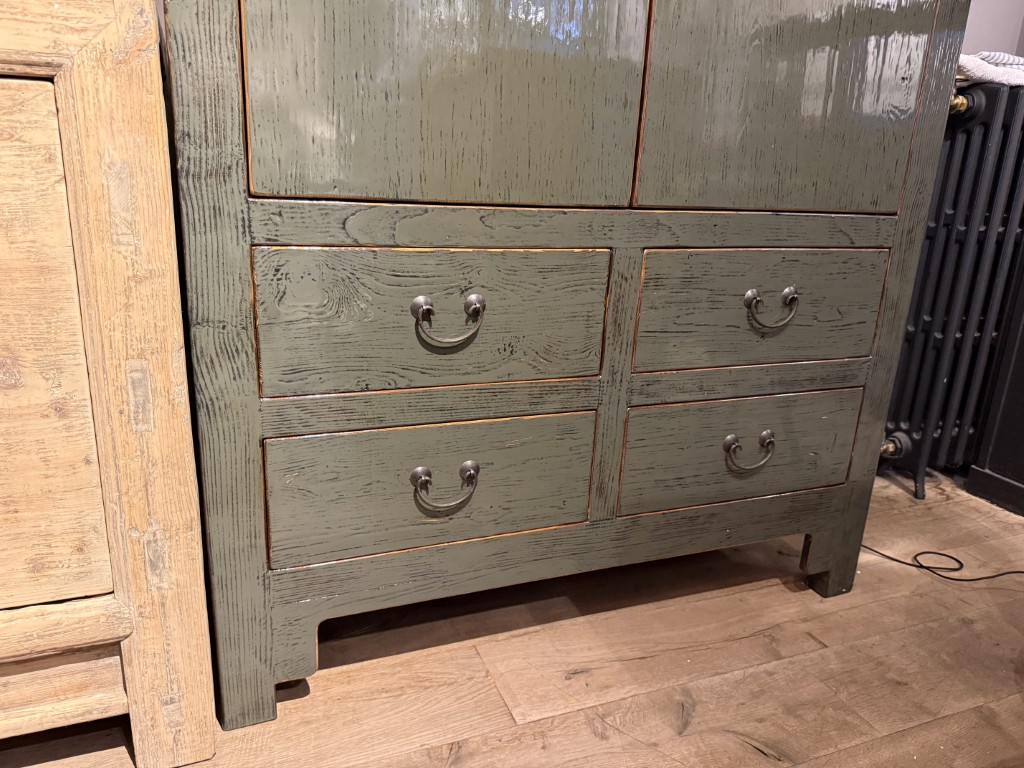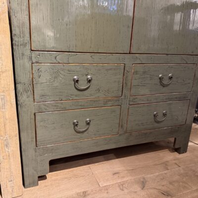 Groen gelakte kast ‘Torino’ met 2 deuren en 4 lades, gemaakt van grenenhout. Ook verkrijgbaar in blank old pine hout.