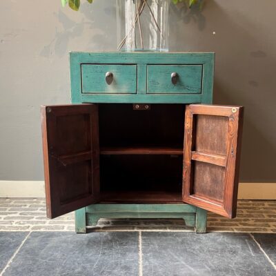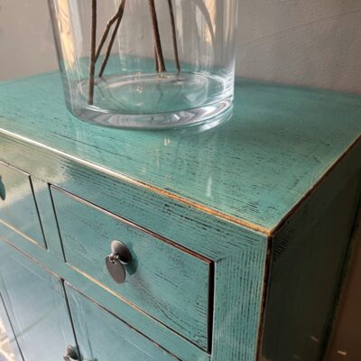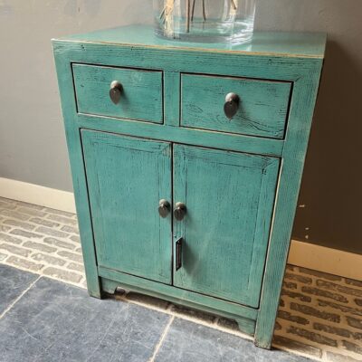 Turquoise gelakt kastje ‘Bastia’ met 2 lades en 2 deuren, gemaakt van old pine hout.