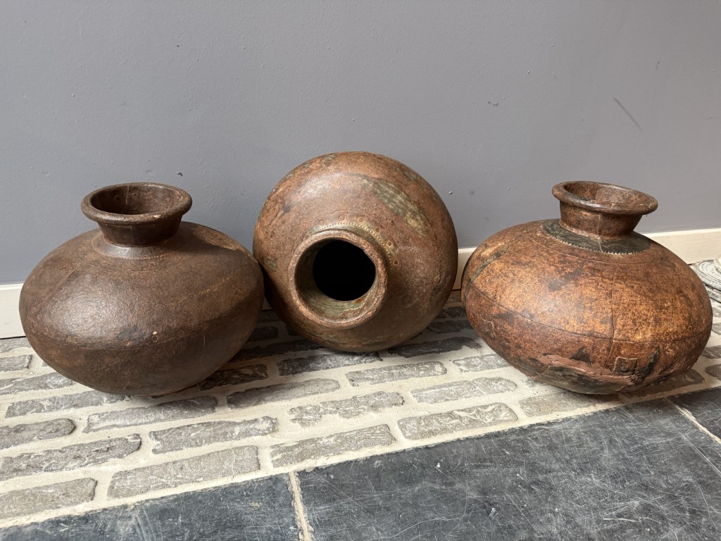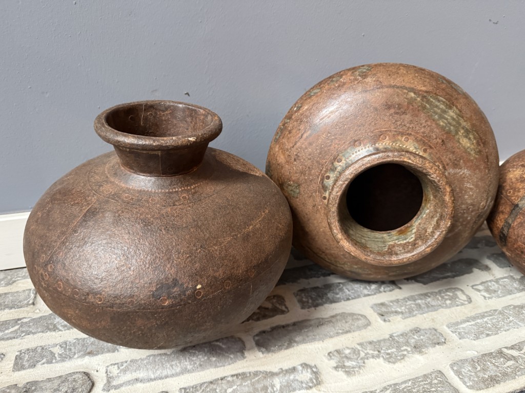 Metalen waterkruiken met een roestige look.