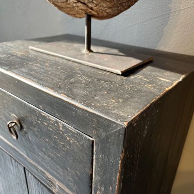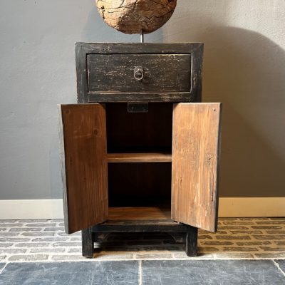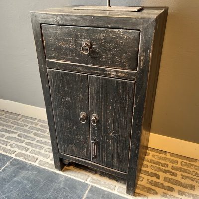 Zwart nachtkastje ‘Cordoba’ met 1 lade en 2 deurtjes, gemaakt van old pine hout.