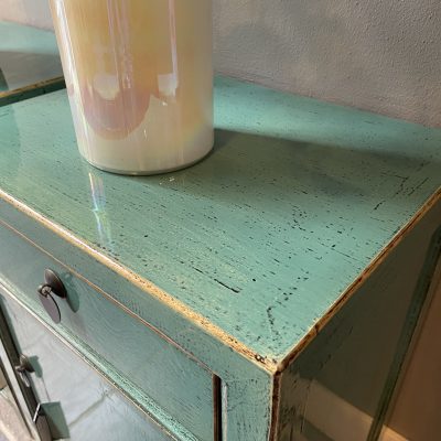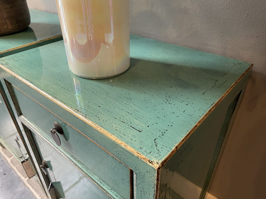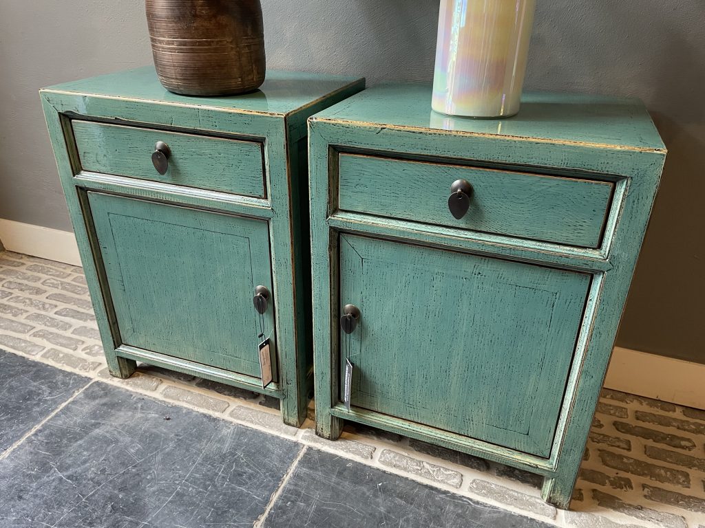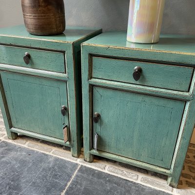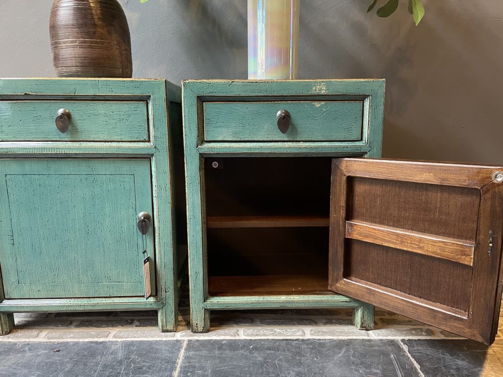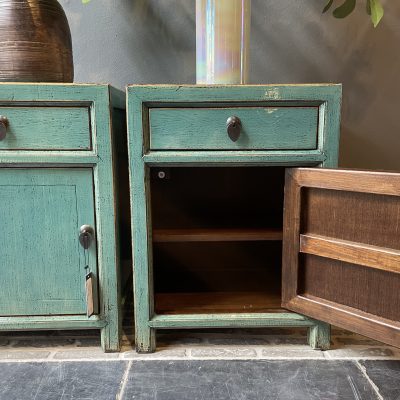 Nachtkastje ‘Mira’ met 1 lade en 1 deurtje, in het turquoise gelakt. Ook verkrijgbaar in donker groen of blank old pine hout.