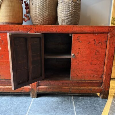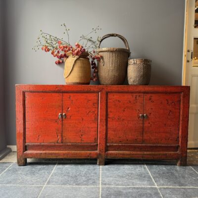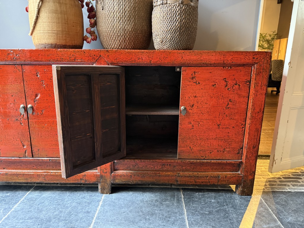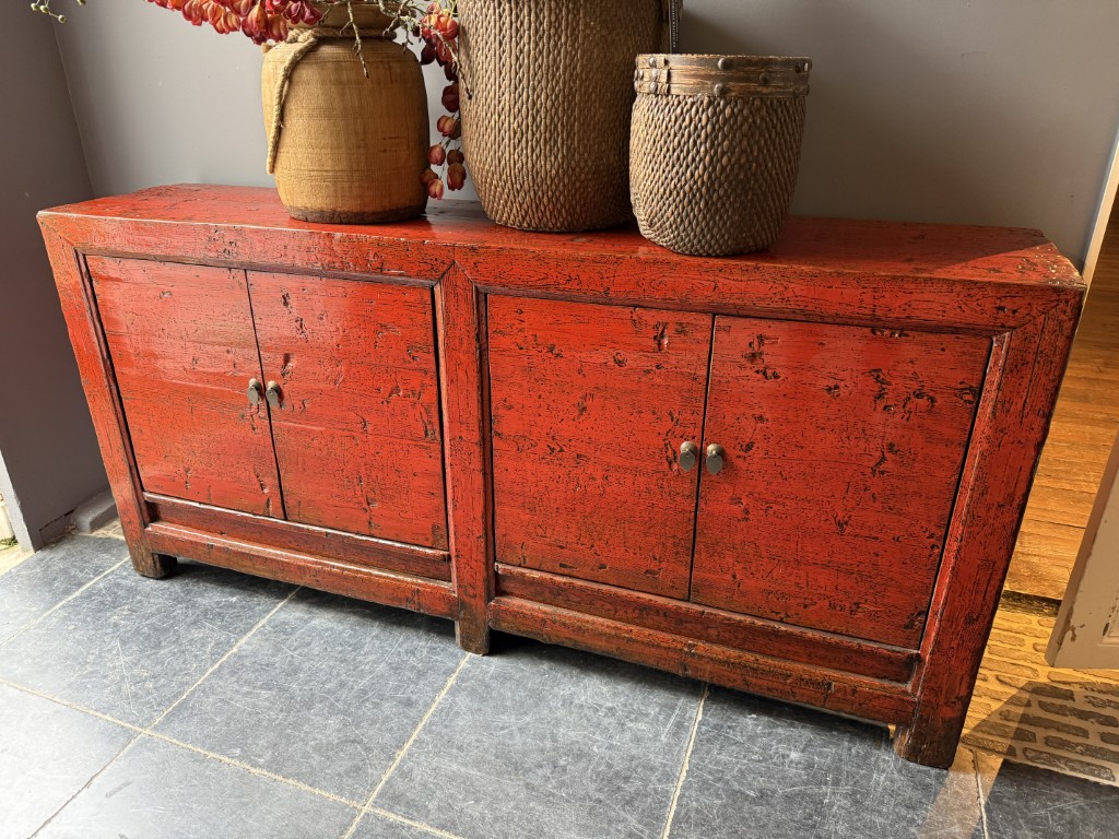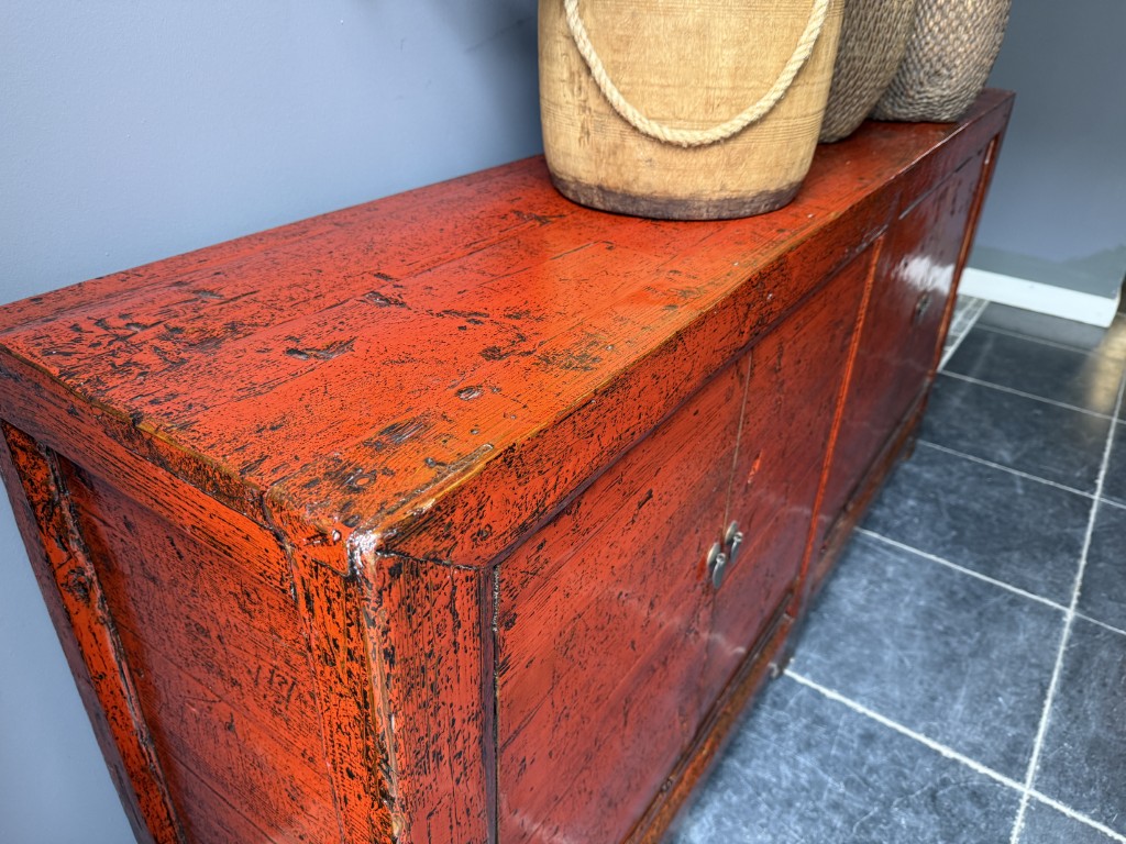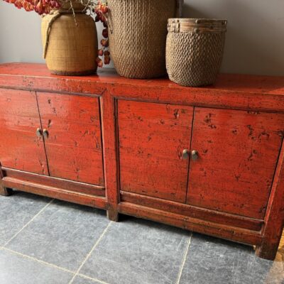 Rood gelakt dressoir met 4 deuren, gemaakt van old pine hout.