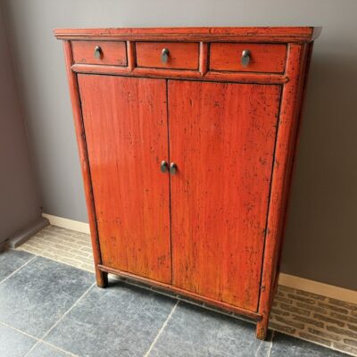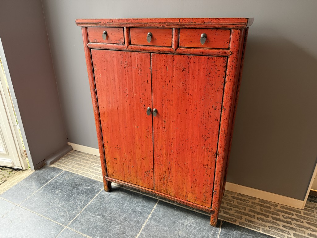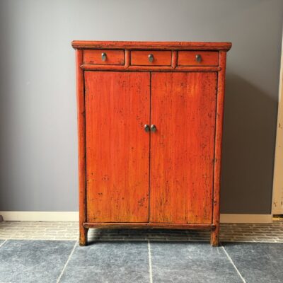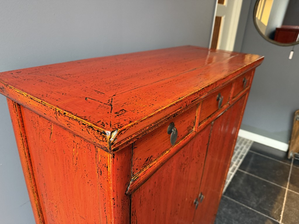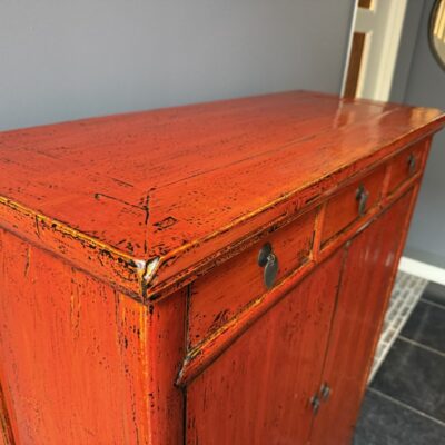 Rood gelakte kast met 2 deuren en 3 lades, gemaakt van old pine hout.