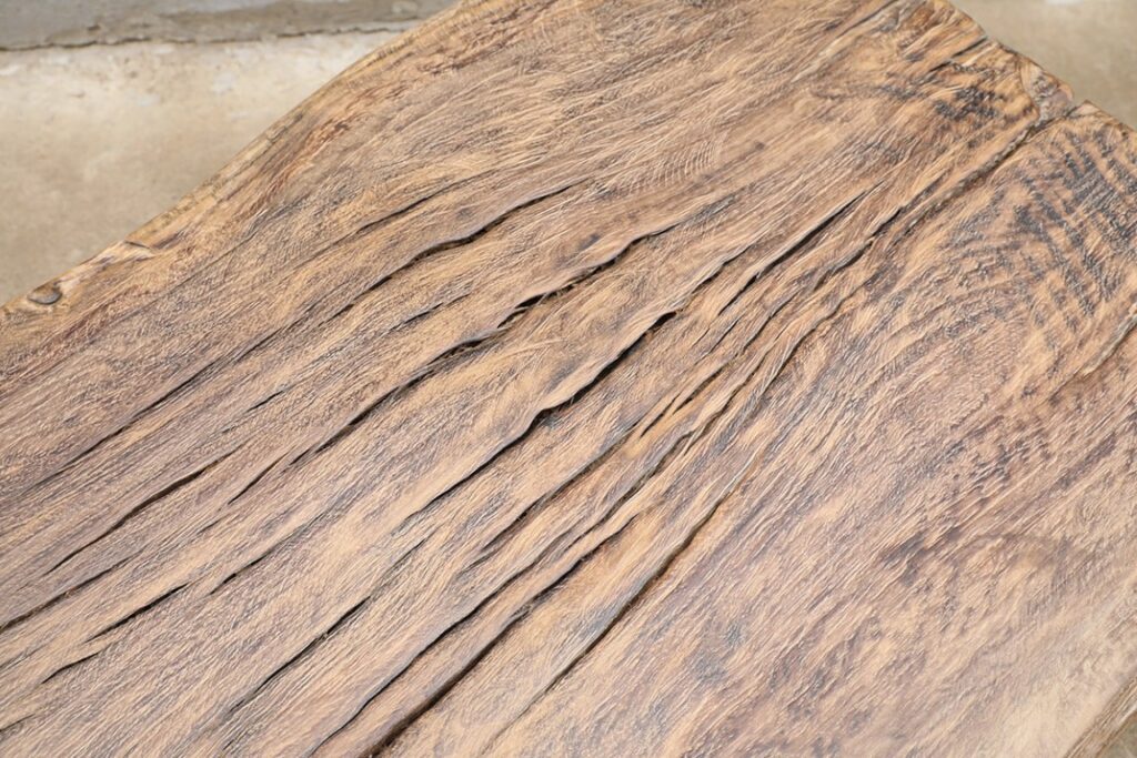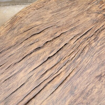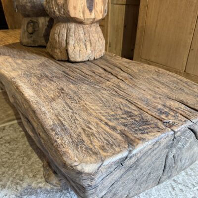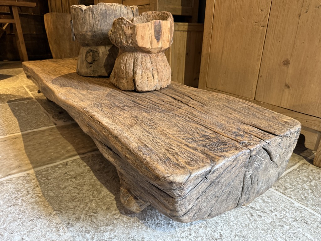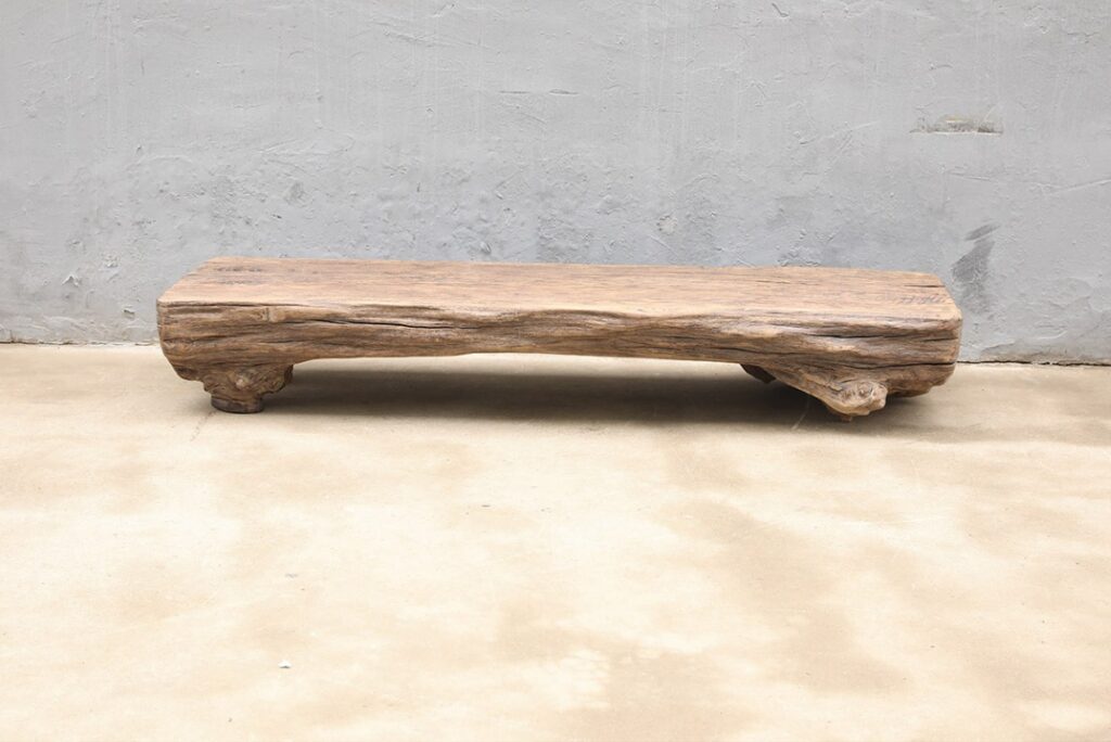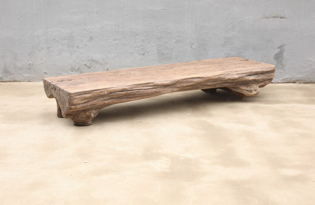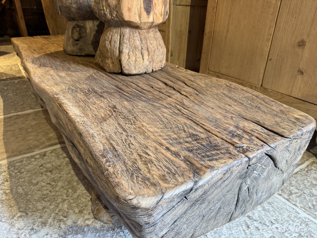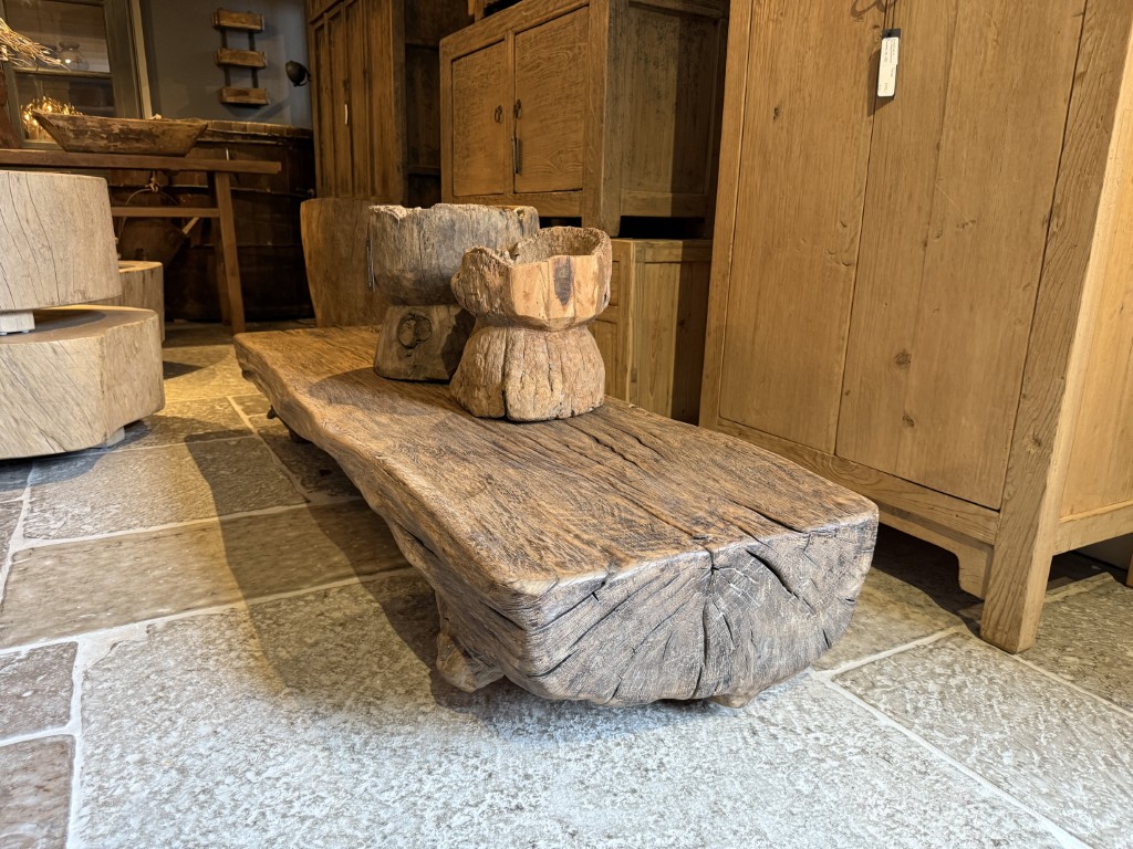 Boomstamsalontafel, gemaakt van grof olmenhout.
