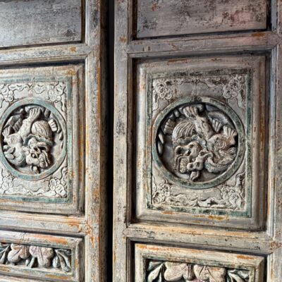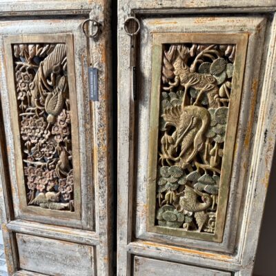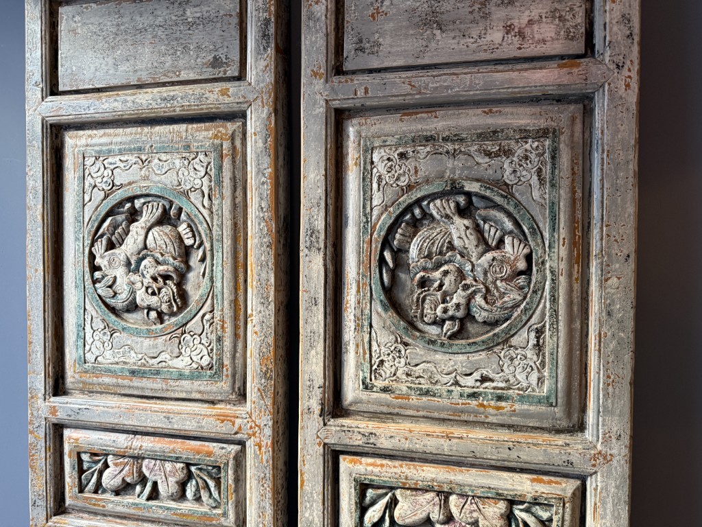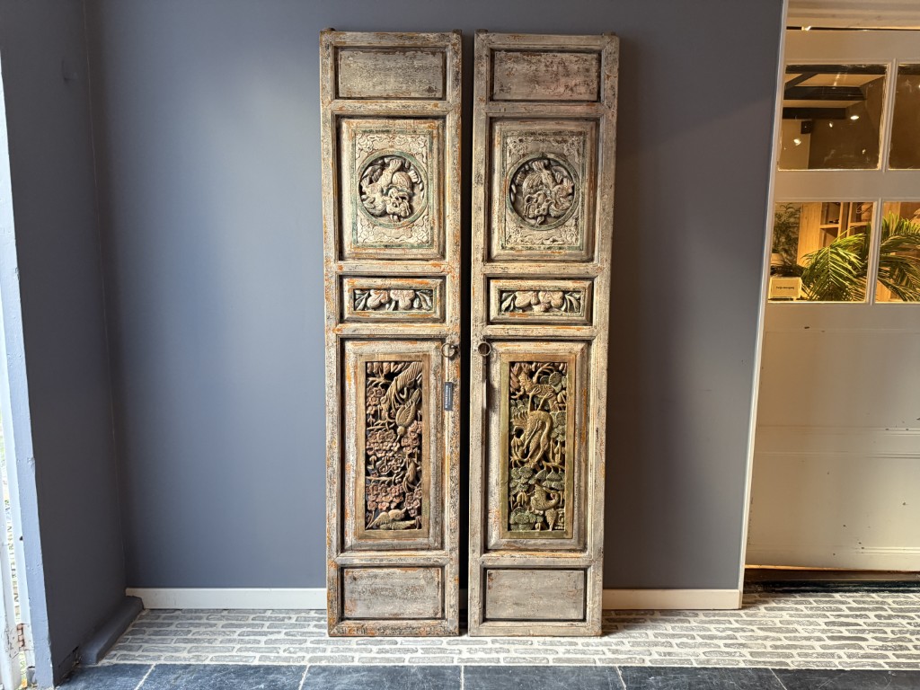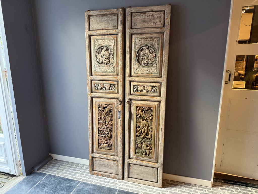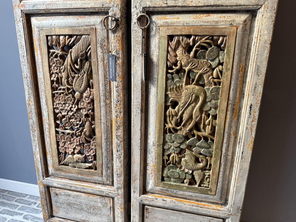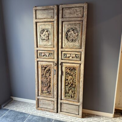 Set van twee antiek Chinese wandpanelen, gemaakt van old pine hout. De prijs is voor de set van twee.