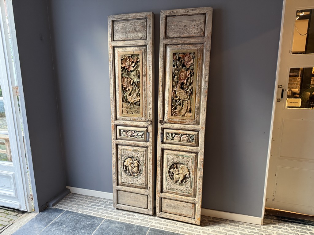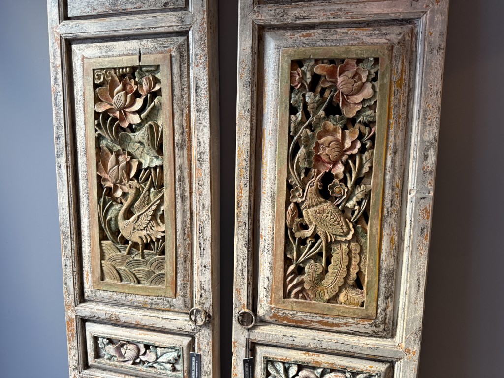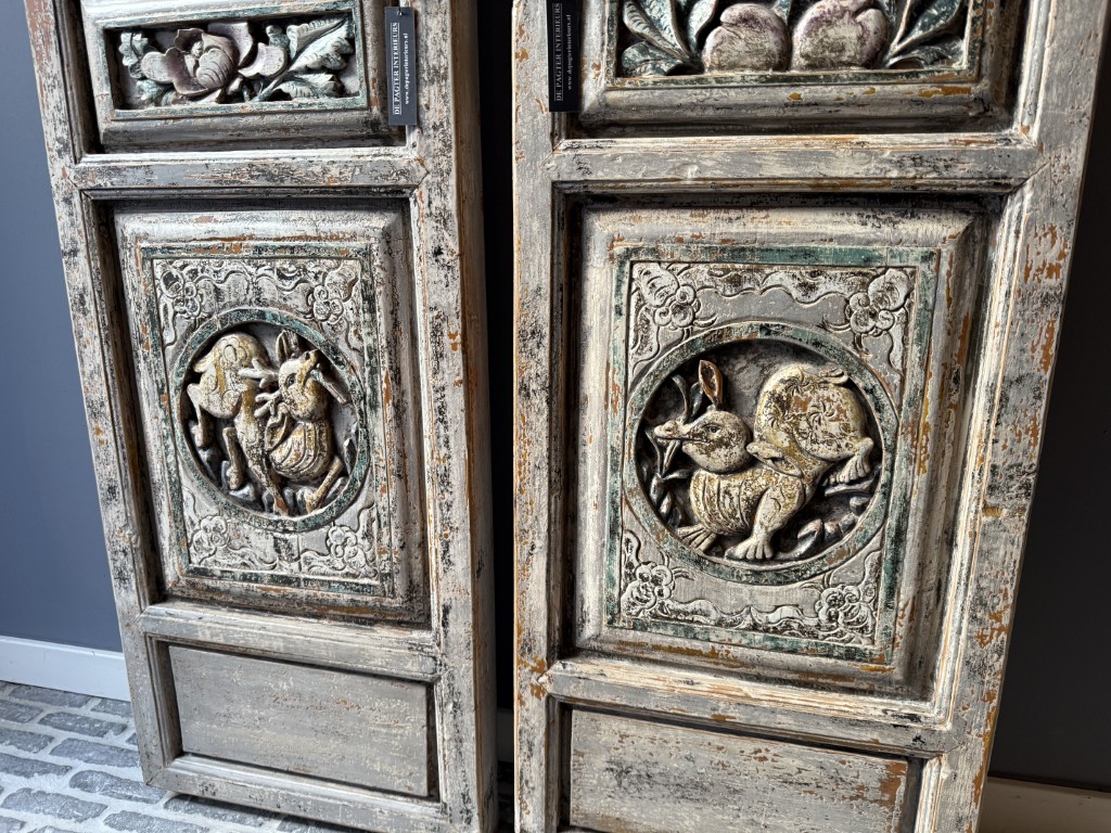 Set van twee antiek Chinese wandpanelen, gemaakt van old pine hout. De prijs is voor de set van twee.