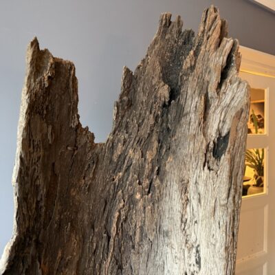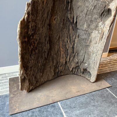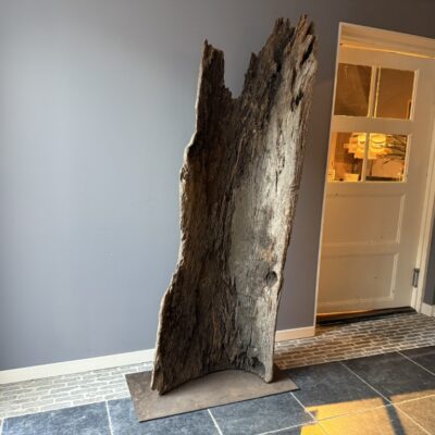 Sierobject, gemaakt van een boomstam op een metalen vloerplaat.