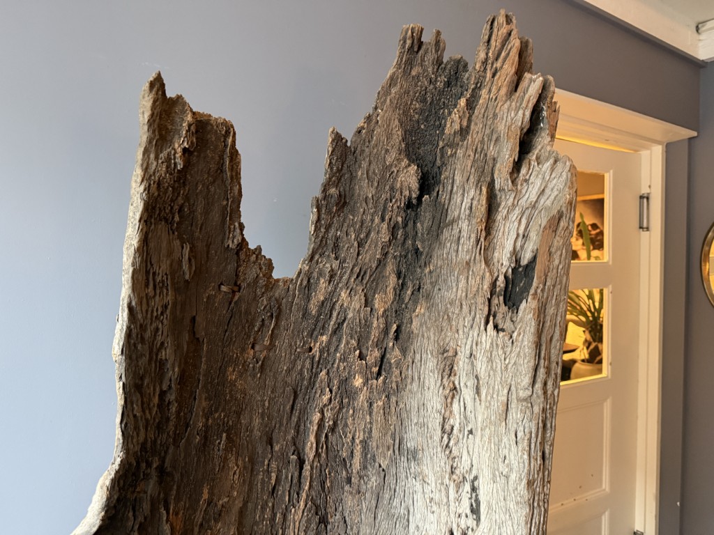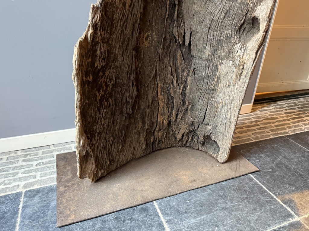 Sierobject, gemaakt van een boomstam op een metalen vloerplaat.