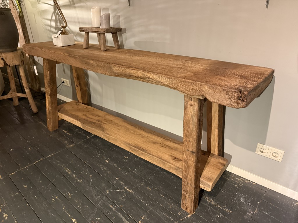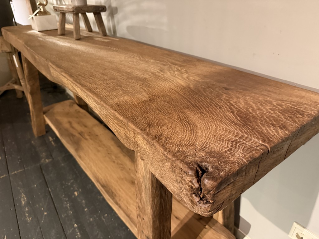 Robuuste wandtafel met een onderplank, gemaakt van grof steeneikenhout. Ook op maat verkrijgbaar.
