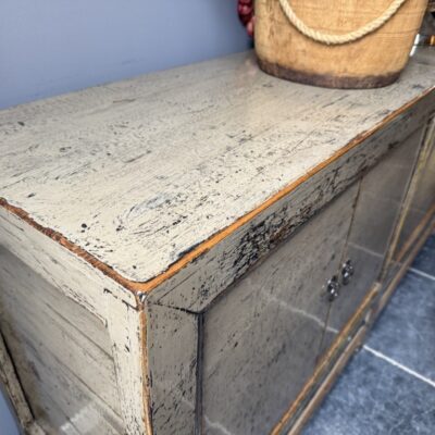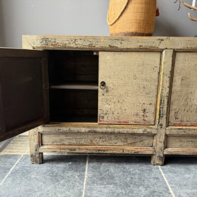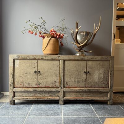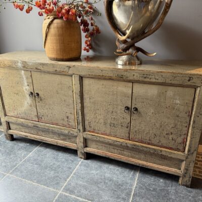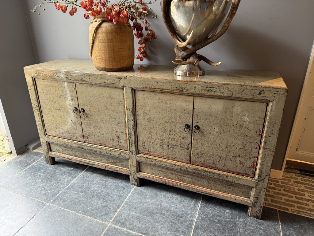 Taupe gelakt dressoir met 4 deuren, gemaakt van old pine hout.