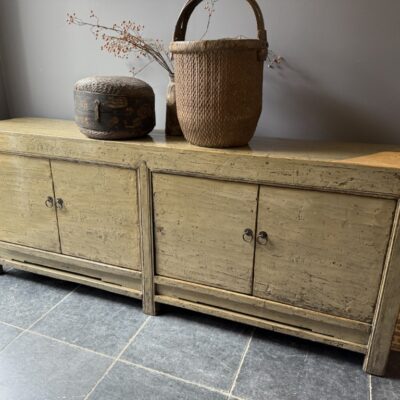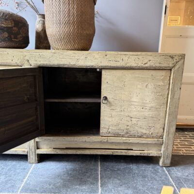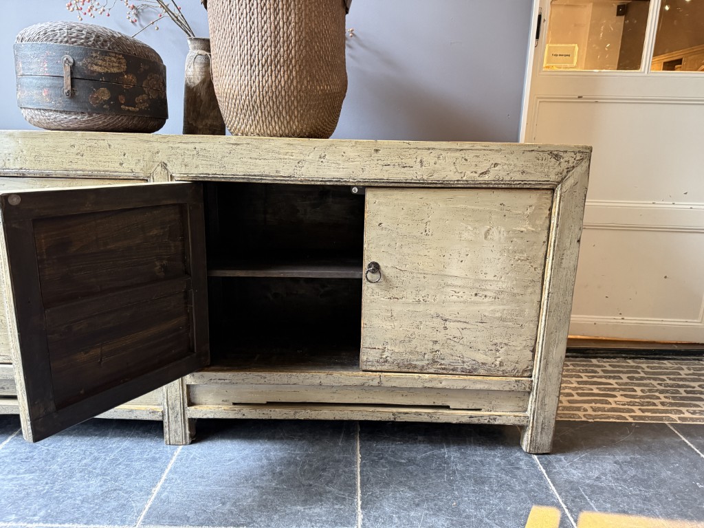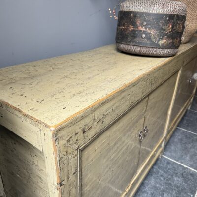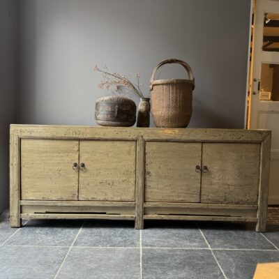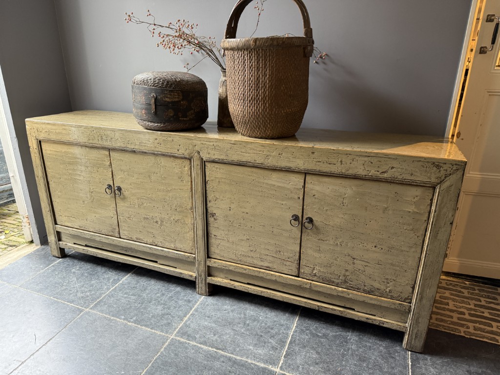 Taupe gelakt dressoir met 4 deuren, gemaakt van old pine hout.
