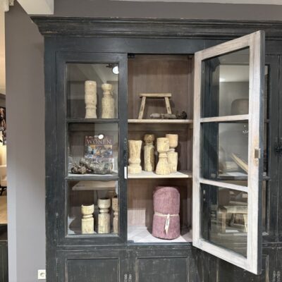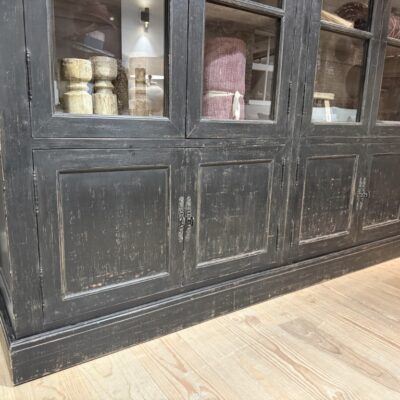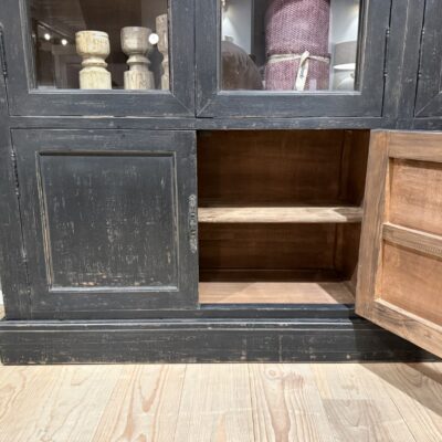 Zwarte vitrinekast ‘Bolzano’ met 8 deuren, gemaakt van old pine hout.
