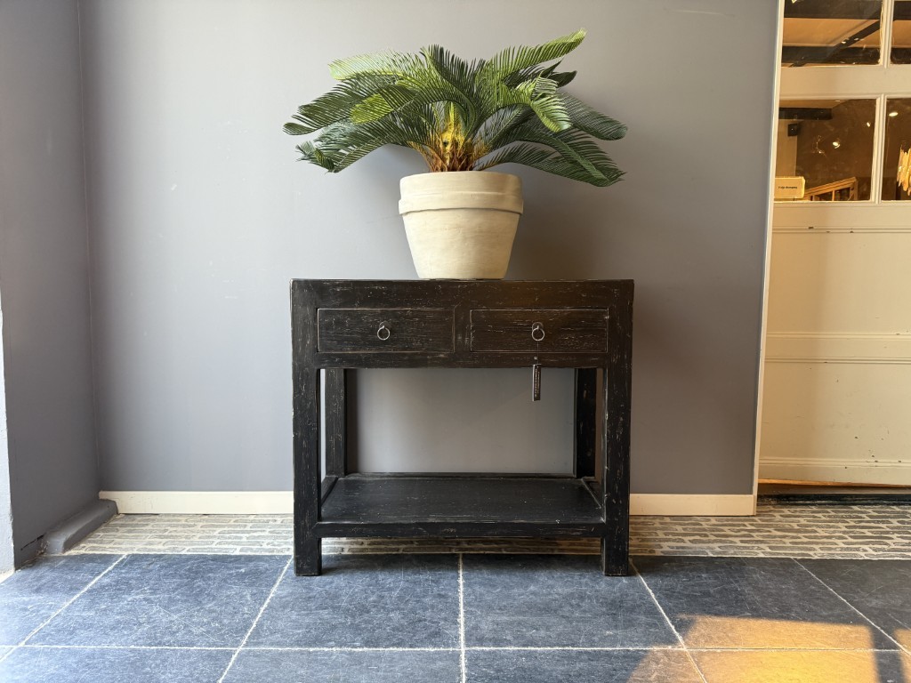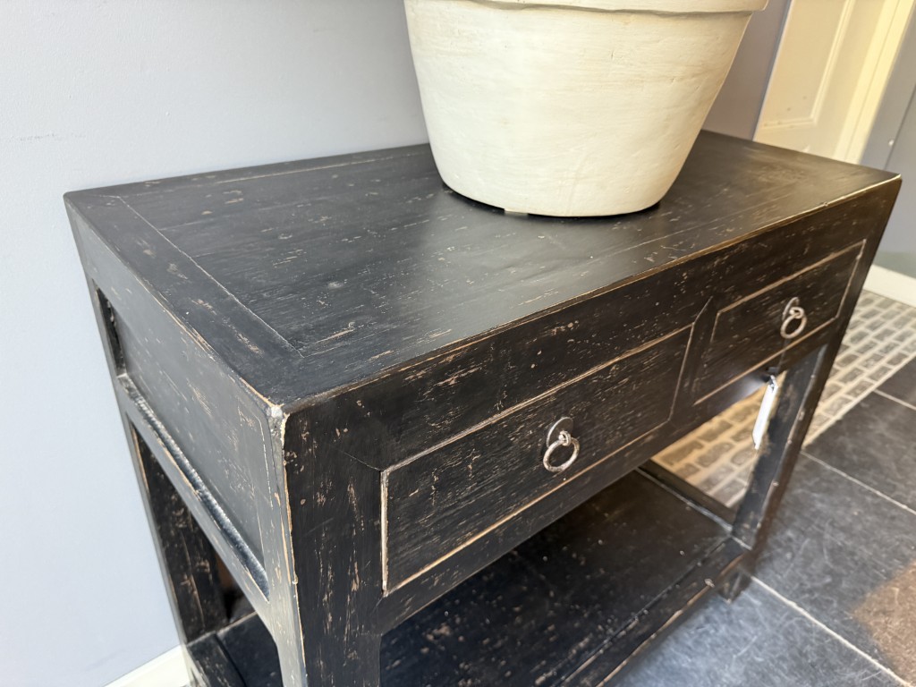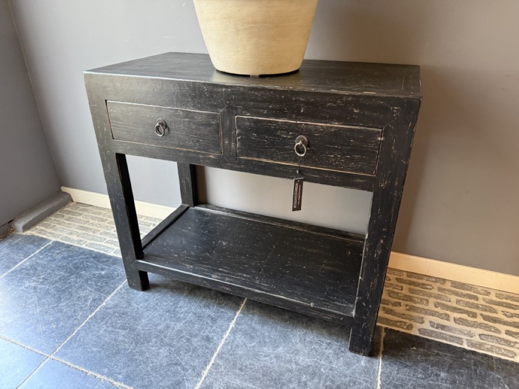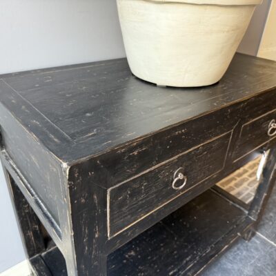 Zwarte wandtafel ‘Savona’ met 2 lades en een onderplank, gemaakt van old pine hout.