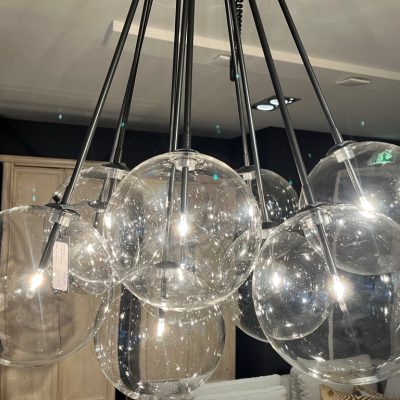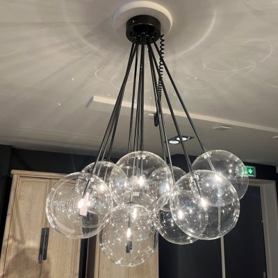 Hanglamp ‘Molecule’ van het merk Eichholtz. Ook verkrijgbaar met goudkleurige constructie.