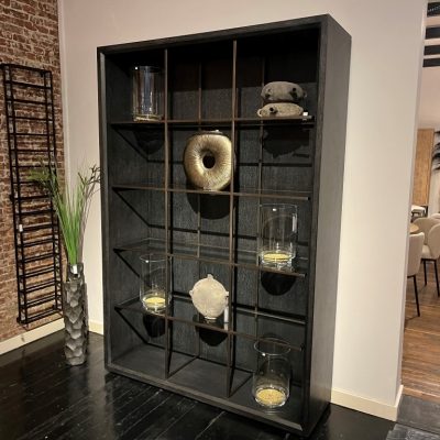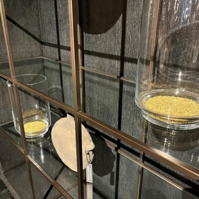 Kast ‘Hennessey’ van het merk Eichholtz. De eikenhouten kast heeft glazen legplanken en een bronzen lijst.