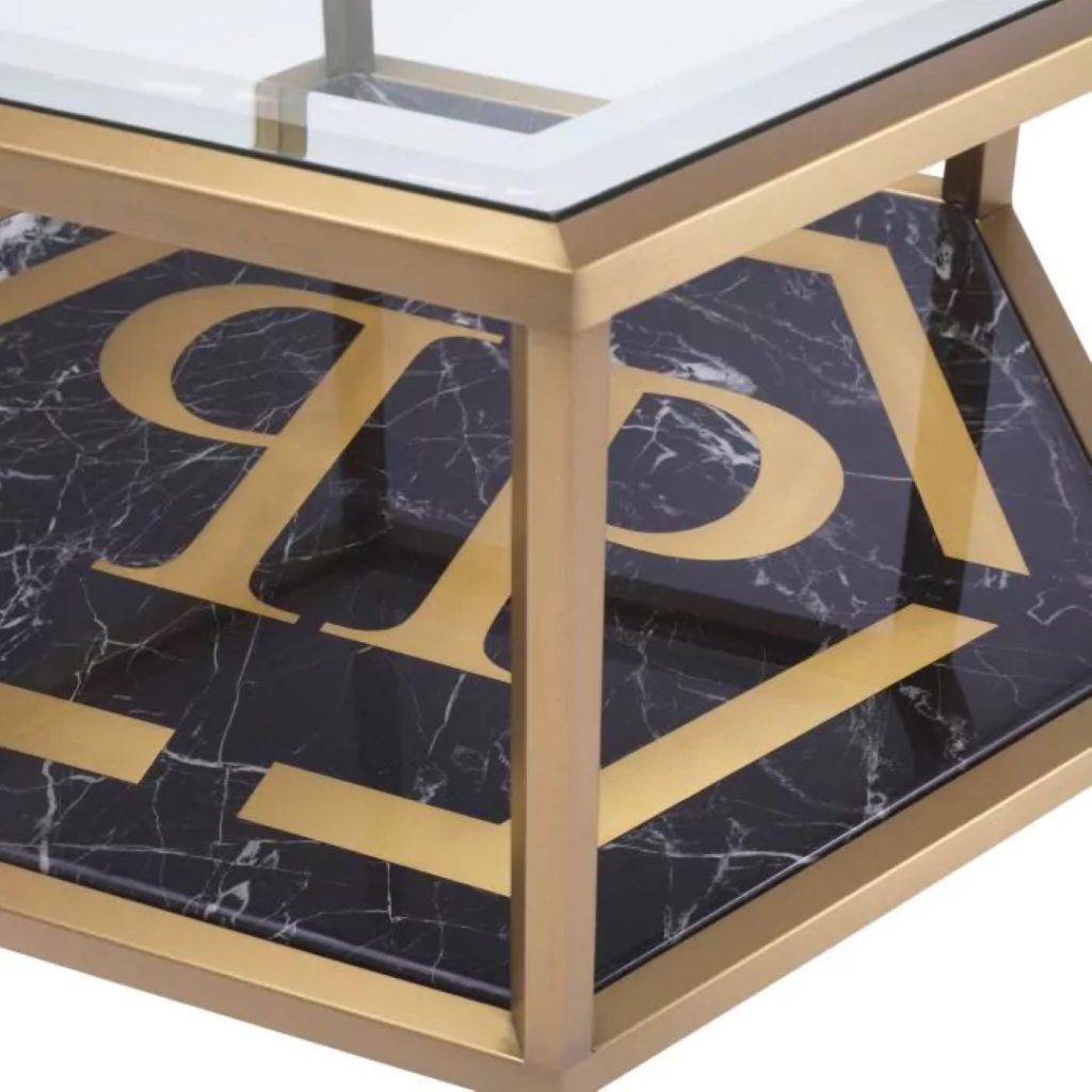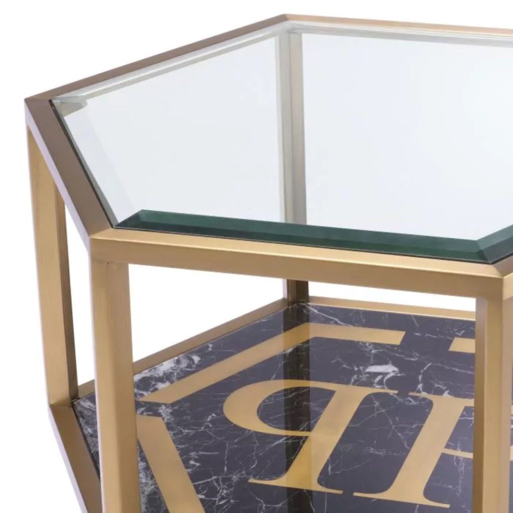 De compacte zeshoekige ‘Falcon View’ salontafel van 60 x 40 cm met imitatiezwart marmer met een goud randje is de perfecte showcase voor het PP-logo. De decadente Italiaanse stijl gecombineerd met het afgeschuinde blad maakt deze salontafel feestklaar.