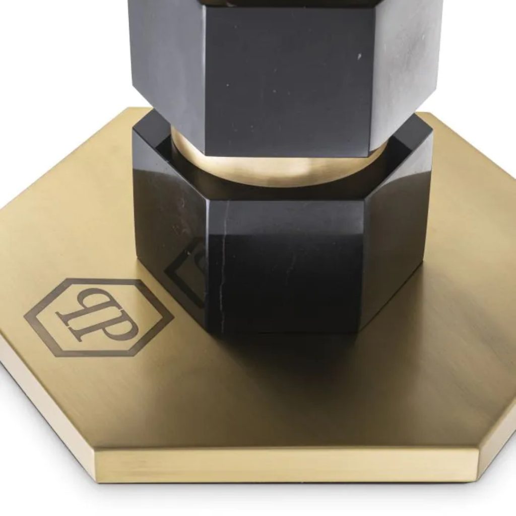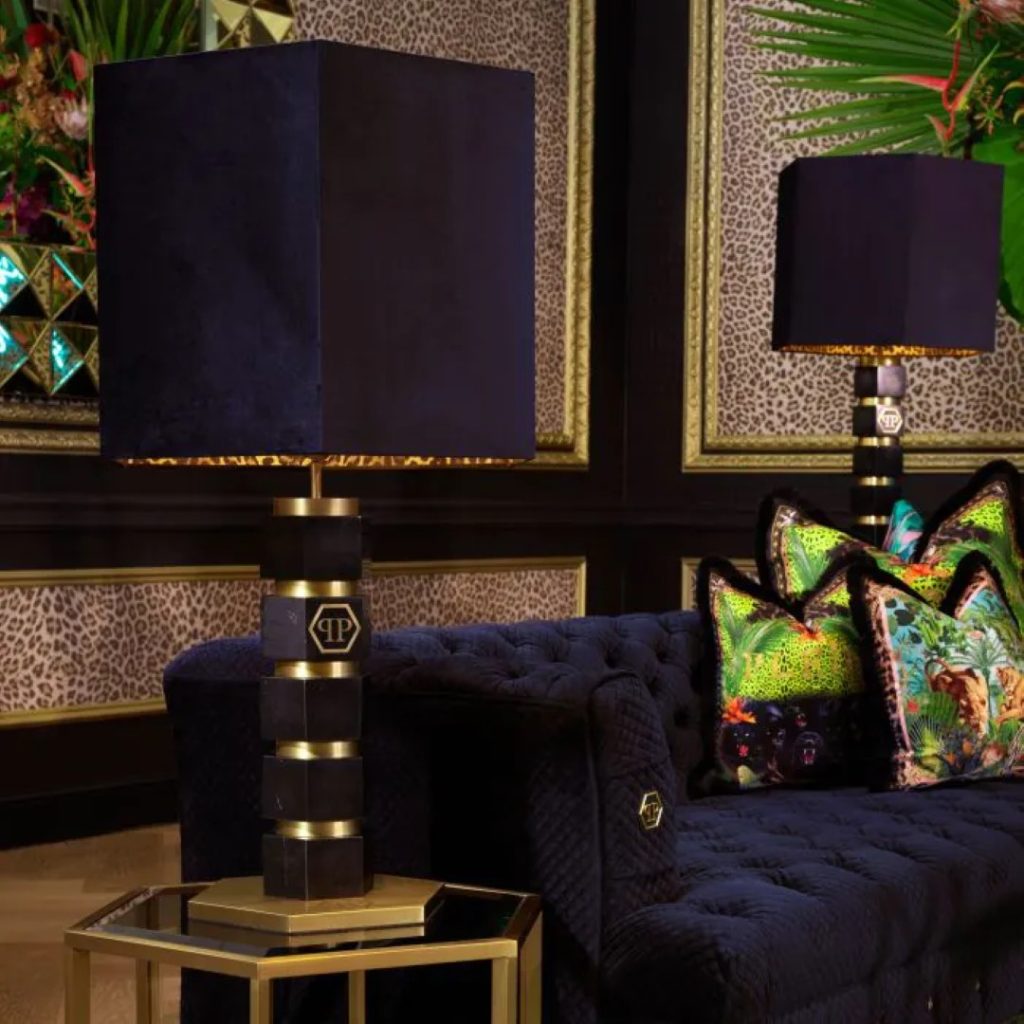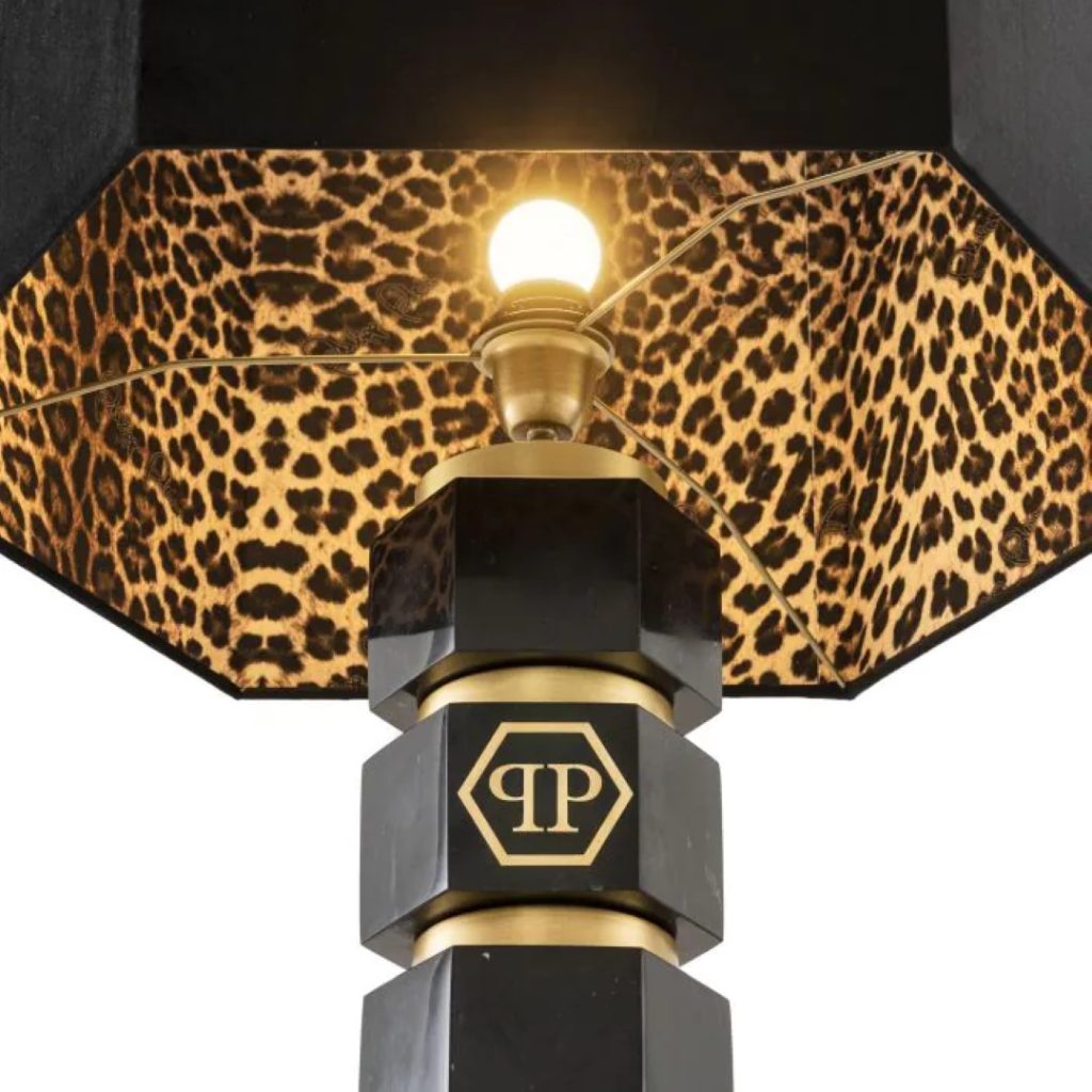 Deze zeshoekige tafellamp is met zijn gefacetteerde zwarte marmeren elementen en antieke koperen steel typisch Philipp Plein. De ‘Hexagon’ tafellamp vormt een perfecte aanvulling voor de woonkamer met zijn contrasterende zeshoekige kap met luipaardprint.