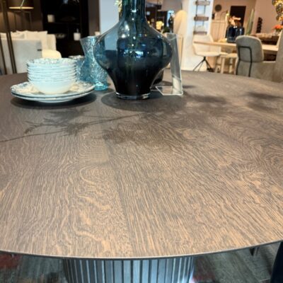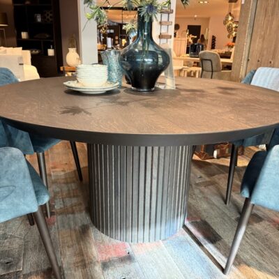 Klassiek-moderne tafel gemaakt van ‘Eiken Grizzly Brown’-eikenhout, ondersteunt door de poot Lattuh in ‘Eiken Grizzly Brown’.